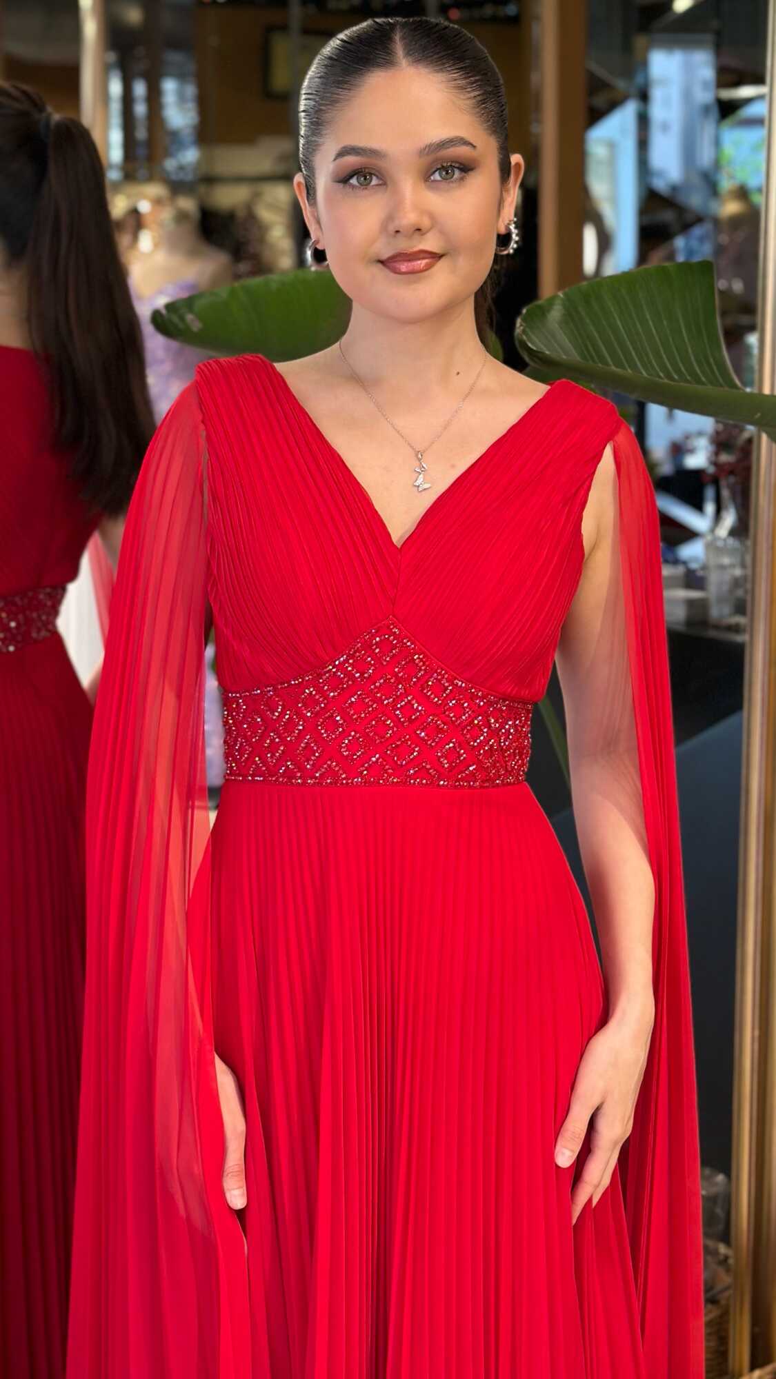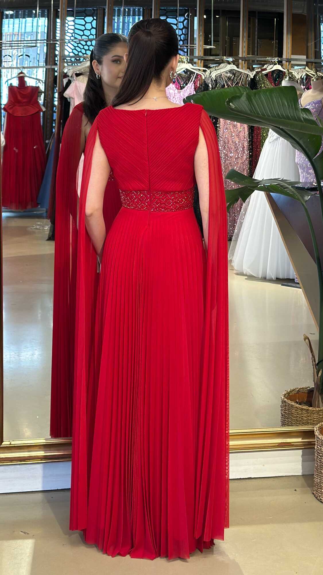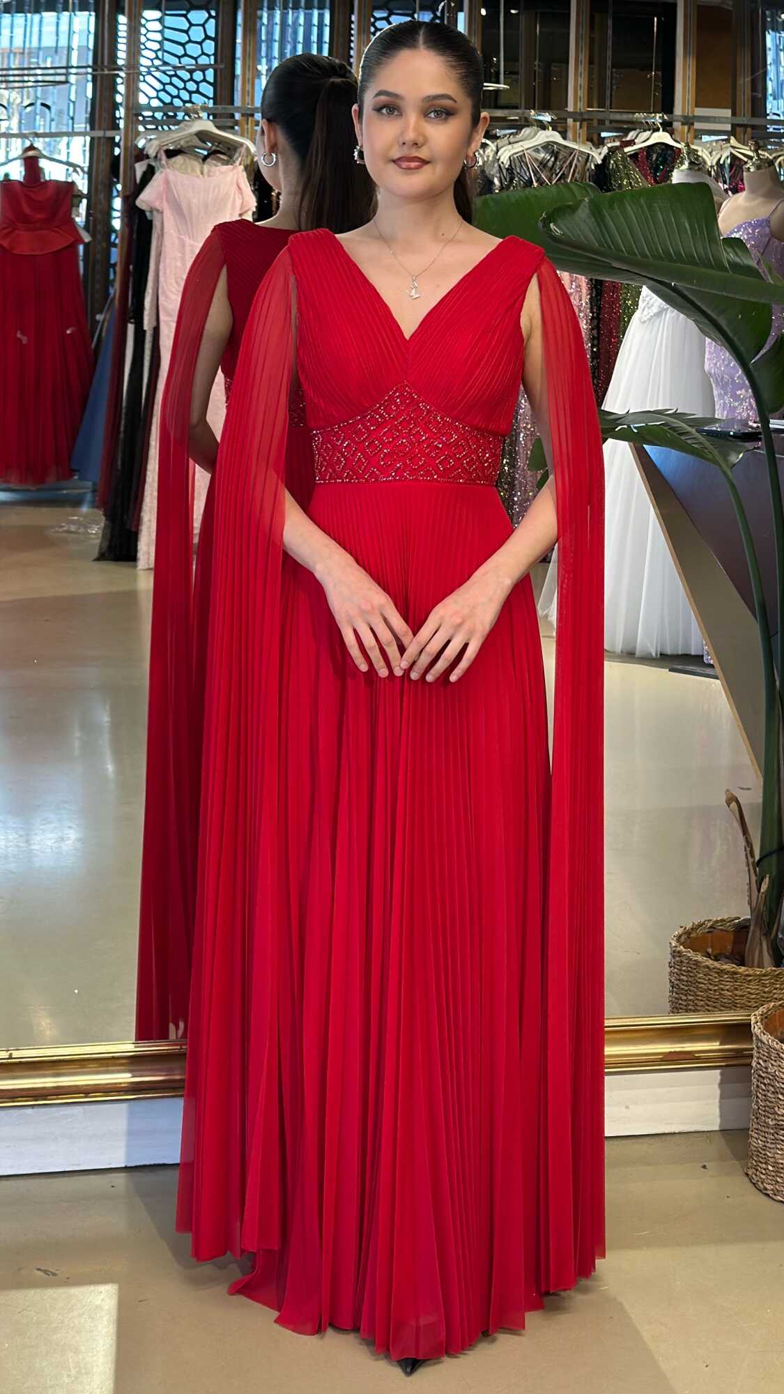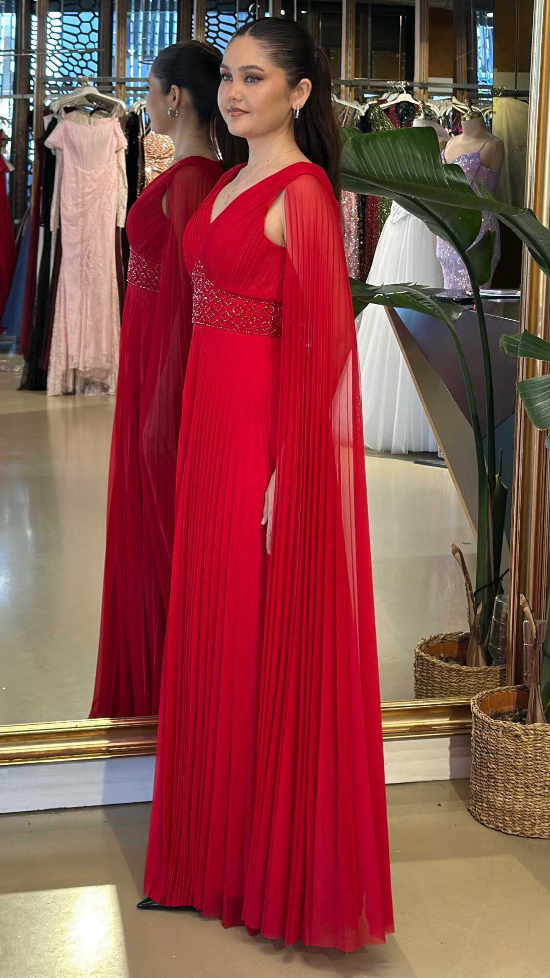V Yaka Kırmızı Renk Kloş Etekli Uzun Abiye Elbise, Şifon Kumaştan Üretilmiş olup Uçuş Uçuş Şifon Kumaş Tüm Dikkatleri Üzerinize Toplayacaktır. Çıkarılabilir peleriniyle iki farklı kullanım imkânı sunar.