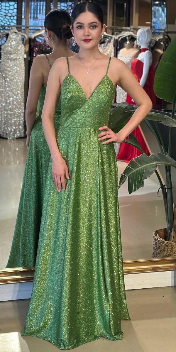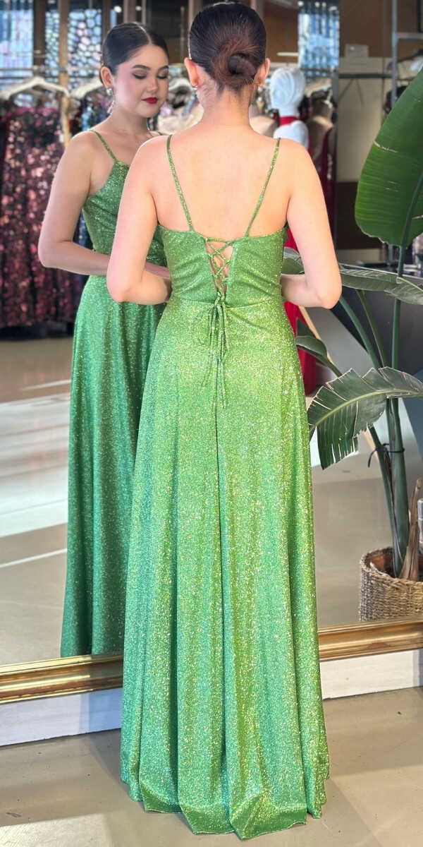 Yeşil V Yaka Kalın Askı Düz Kesim Simli Uzun Abiye Elbise 7557