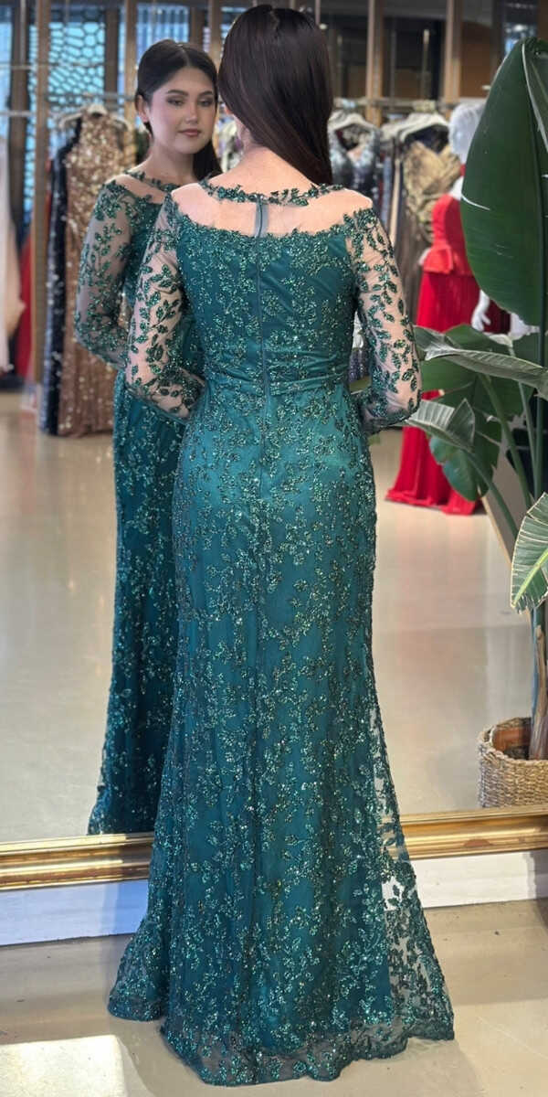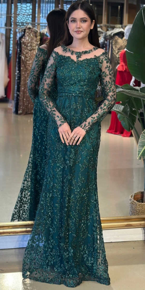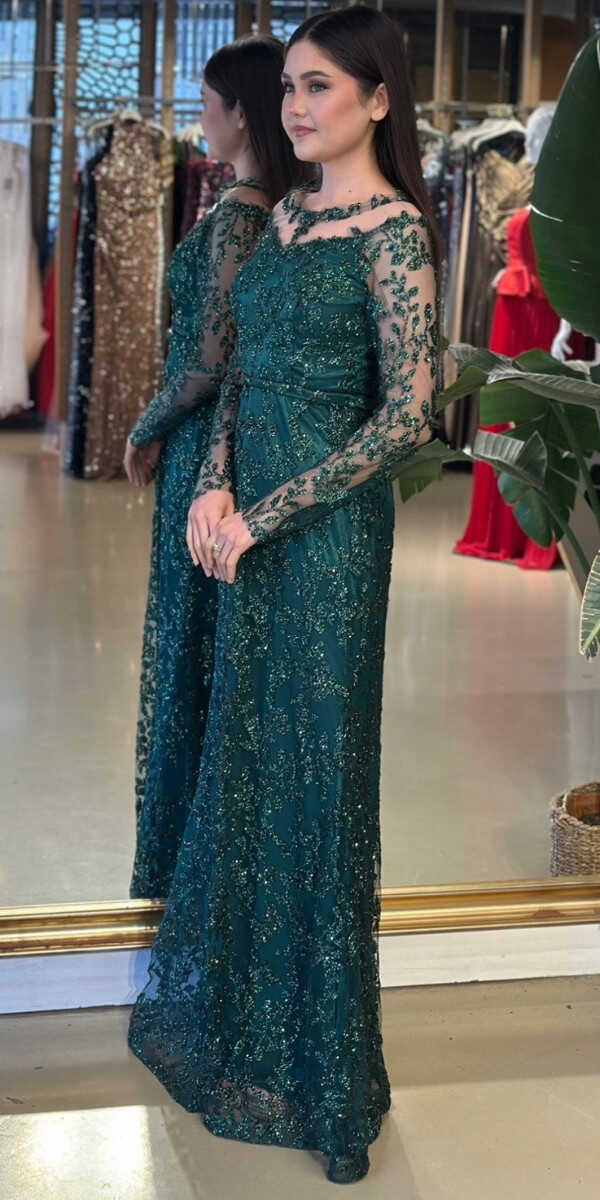 Yuvarlak Yaka Koyu Yeşil Renk Düz Kesim Uzun Abiye Elbise, Simli Kumaştan Üretilmiş olup Simlerin Işıltısıyla Çok Hoş Gözükeceksiniz. Uzun kollarıyla, kollarınızı zarif bir şekilde kapatır.