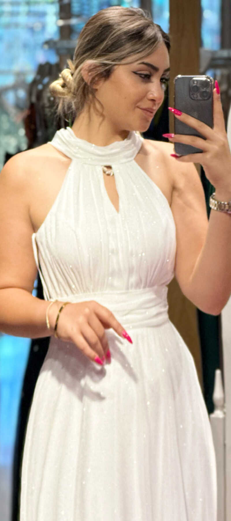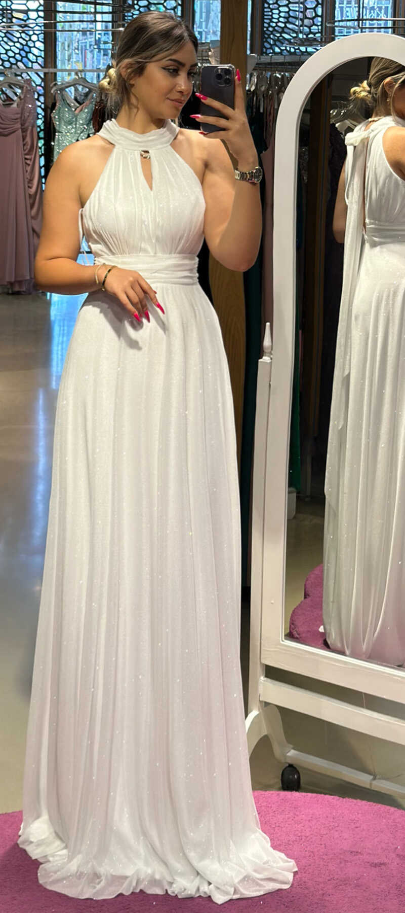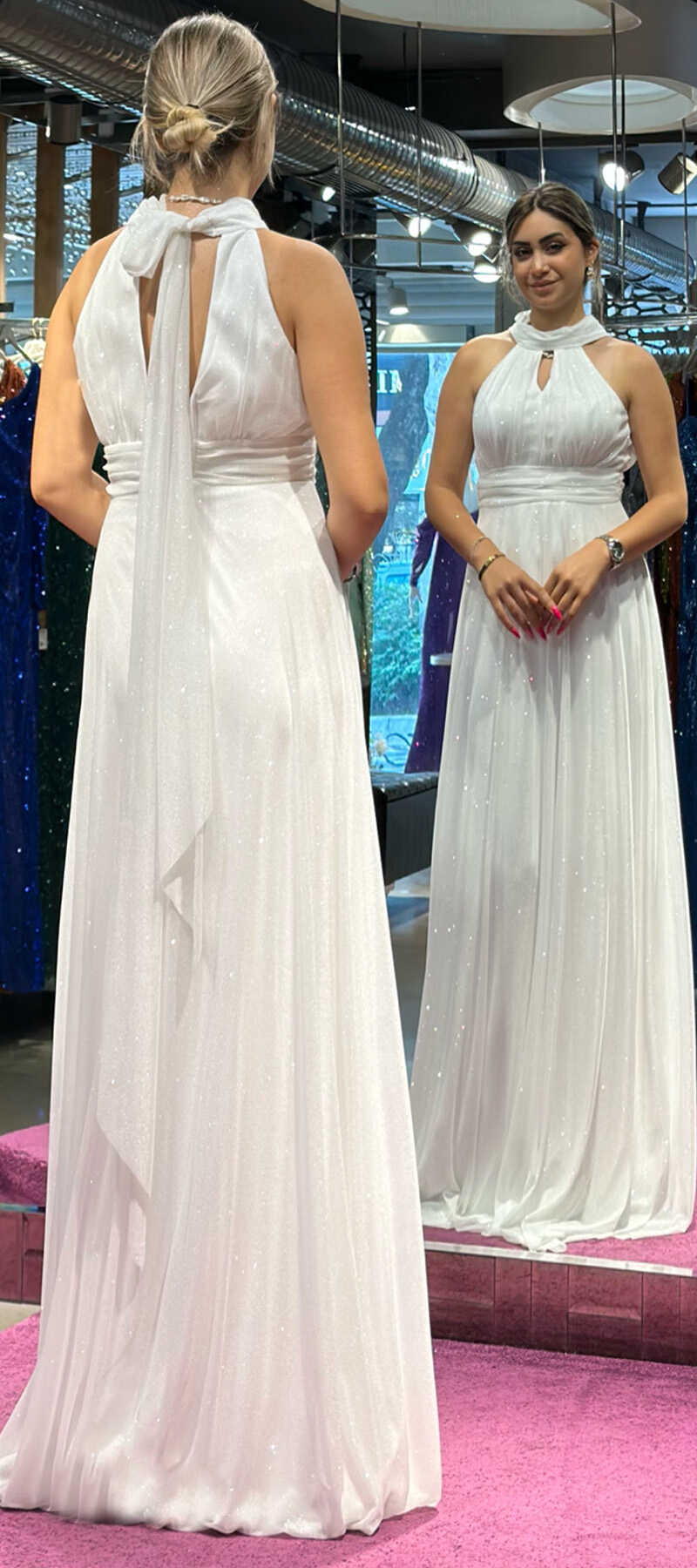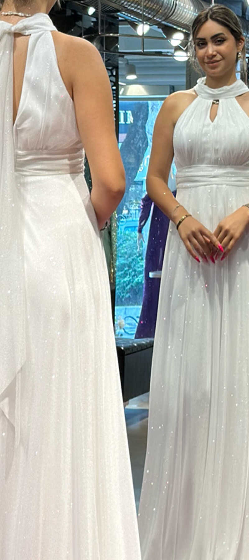 Krem Renk Kloş Etekli Uzun Abiye Elbise, Simli Kumaştan Üretilmiş Olup Işıl Işıl Görüntüsüyle Gözleri Kamaştıracaktır.