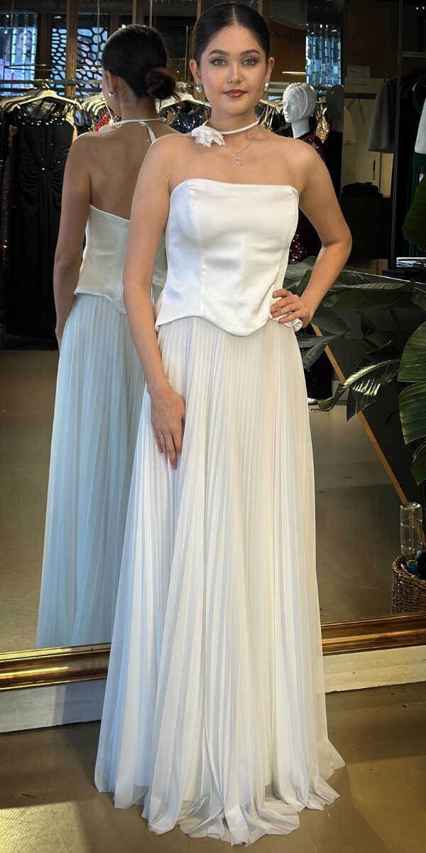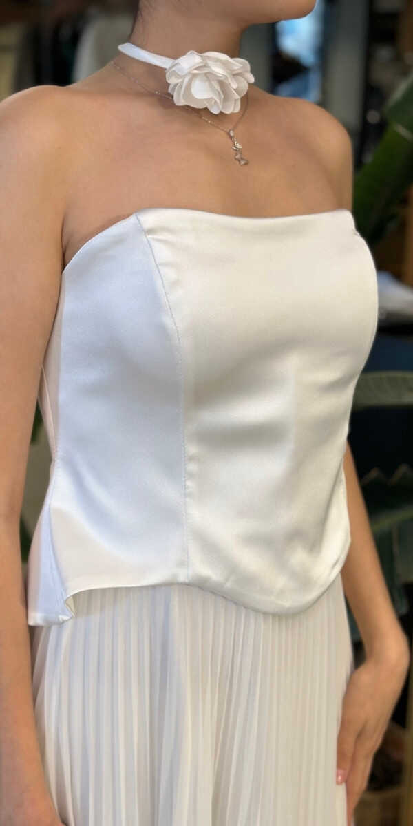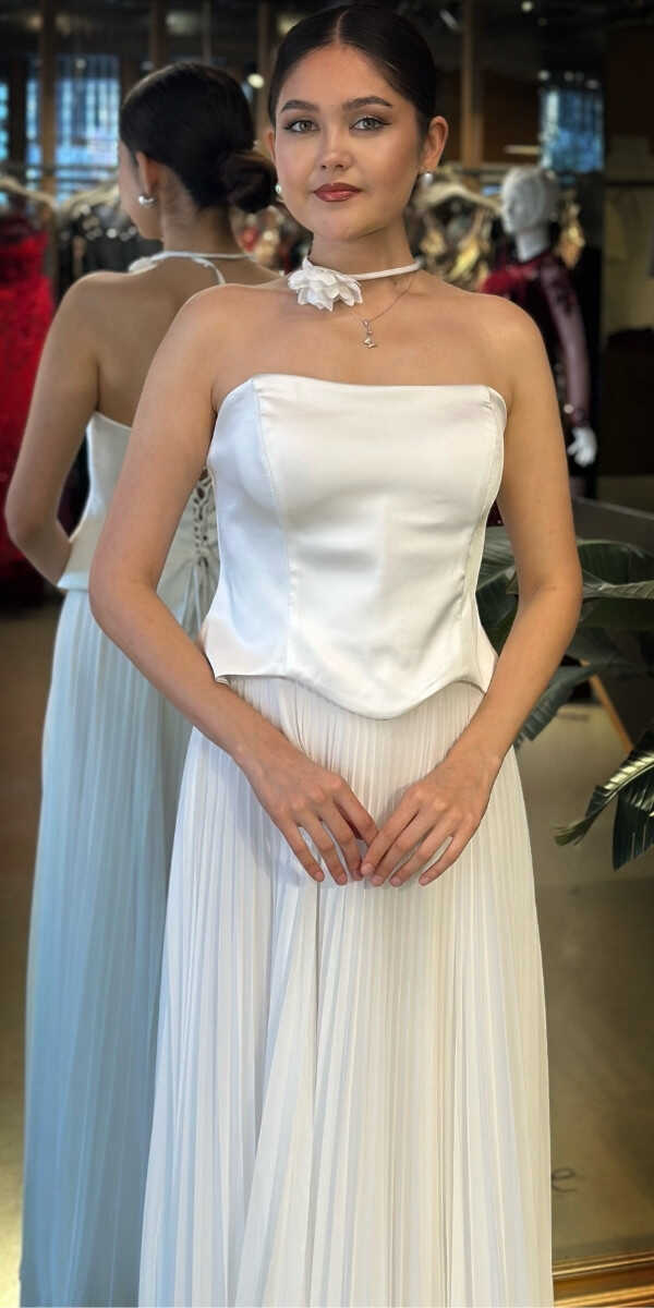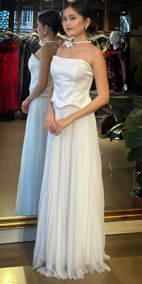 Straplez Yaka Krem Renk Kloş Etekli Uzun Abiye Elbise, Tül Kumaştan Üretilmiş olup Uçuş Uçuş Şifon Kumaş Tüm Dikkatleri Üzerinize Toplayacaktır. Çiçek Detayı Modern Bir Görünüm Yaratacaktır.