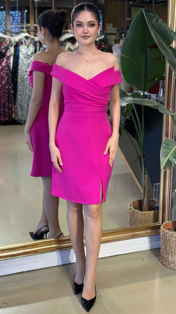 Beyaz Balon Kollu Sırt Dekolteli Düz Kesim Krep Kısa Abiye Elbise 7280