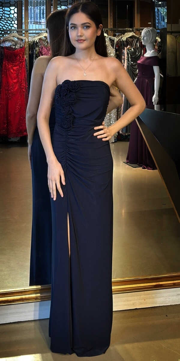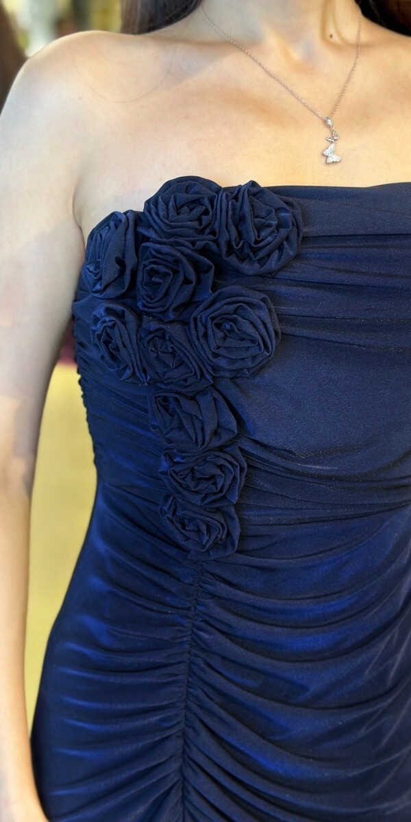 Lacivert Renk Düz Kesim Uzun Abiye Elbise, Likralı Kumaştan Üretilmiş olup Rahatlık Seviyesini Arttıran, Çok Konforlu, Pürüzsüz, Yumuşak Olmasıyla Tüm Gününüzün Kalitesini Arttıracaktır.. Çiçek Detayı Modern Bir Görünüm Yaratacaktır.. Yırtmaç Detayı Cesur ve Çarpıcı Bir Stil Sunacaktır.
