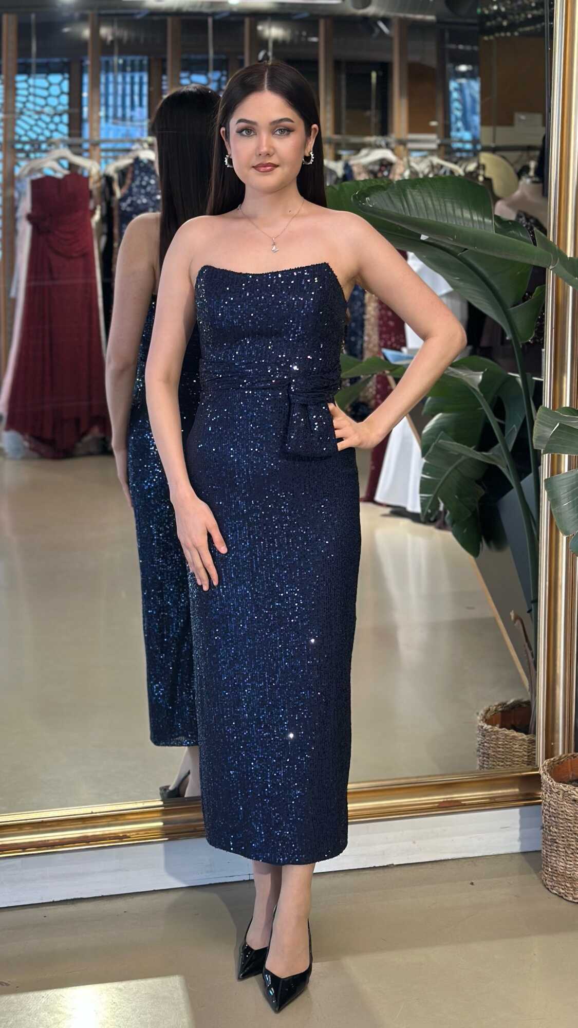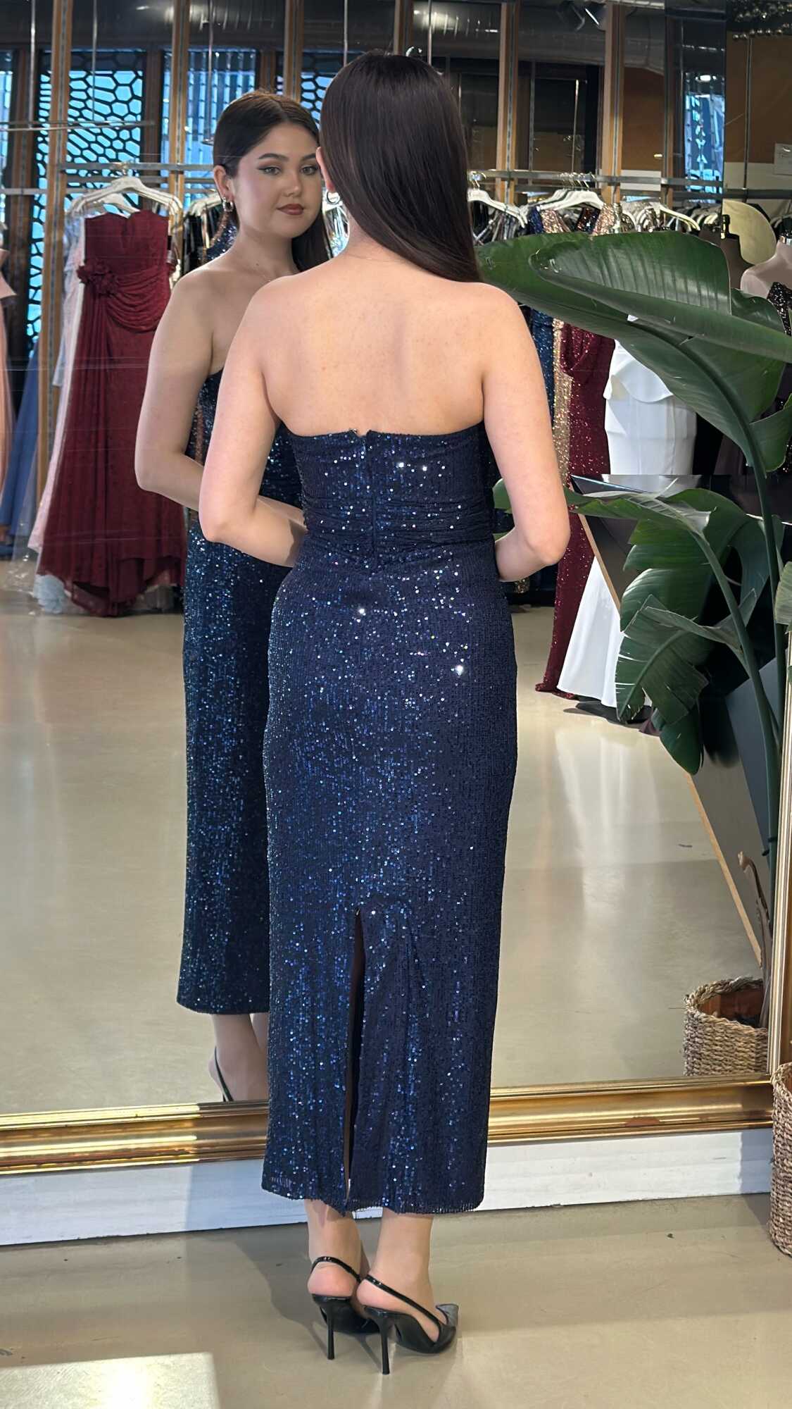 Lacivert Düz Kesim Payet Midi Abiye Elbise 7716