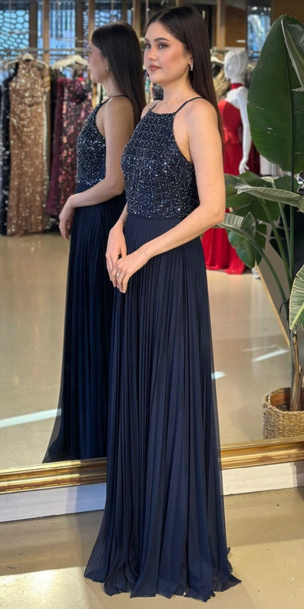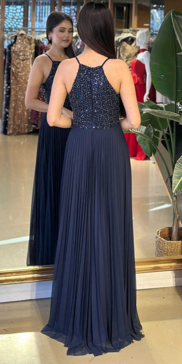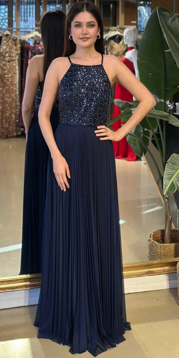 Halter Yaka Lacivert Renk Kloş Etekli Uzun Abiye Elbise, Şifon Kumaştan Üretilmiş olup Uçuş Uçuş Şifon Kumaş Tüm Dikkatleri Üzerinize Toplayacaktır.