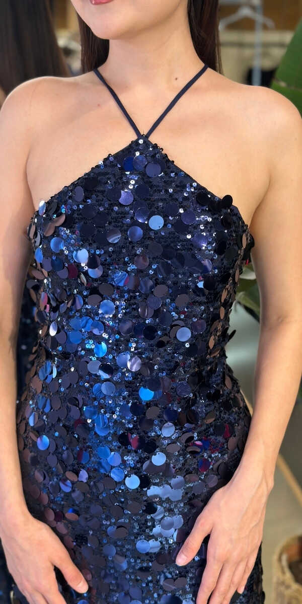 Halter Yaka Lacivert Renk Düz Kesim Midi Abiye Elbise, Payet Kumaştan Üretilmiş olup Pırıltısıyla Göz Kamaştıracaktır. Şık Sırt Dekoltesi Size Çok Yakışacak. Yırtmaç Detayı Cesur ve Çarpıcı Bir Stil Sunacaktır.