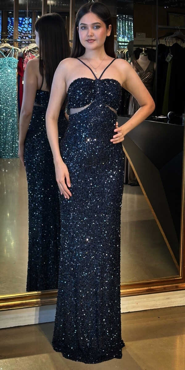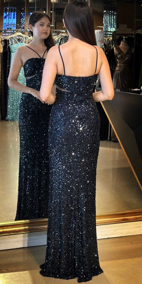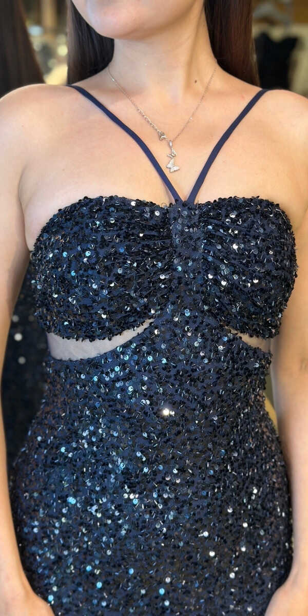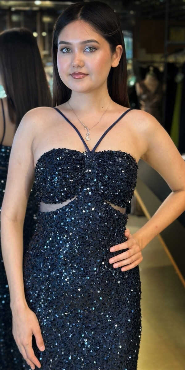 Lacivert Renk Düz Kesim Uzun Abiye Elbise, Payet Kumaştan Üretilmiş olup Pırıltısıyla Göz Kamaştıracaktır. Elbisedeki İp Askılar Kullanım Kolaylığı Yaratacaktır.