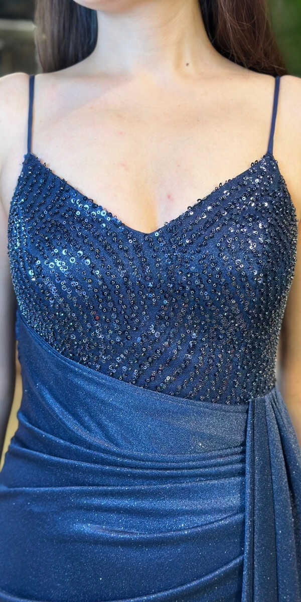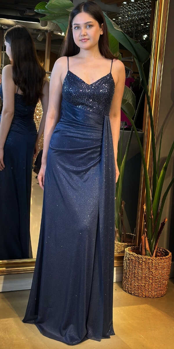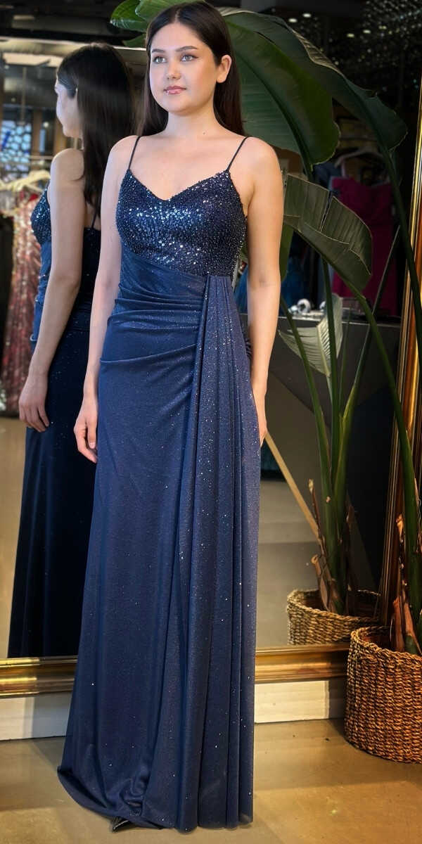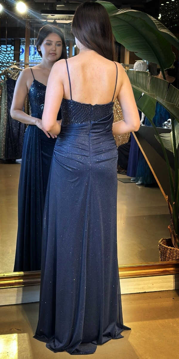 Lacivert Renk Düz Kesim Uzun Abiye Elbise, Simli Kumaştan Üretilmiş olup Simlerin Işıltısıyla Çok Hoş Gözükeceksiniz Elbisedeki İp Askılar Kullanım Kolaylığı Yaratacaktır.