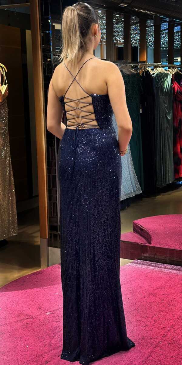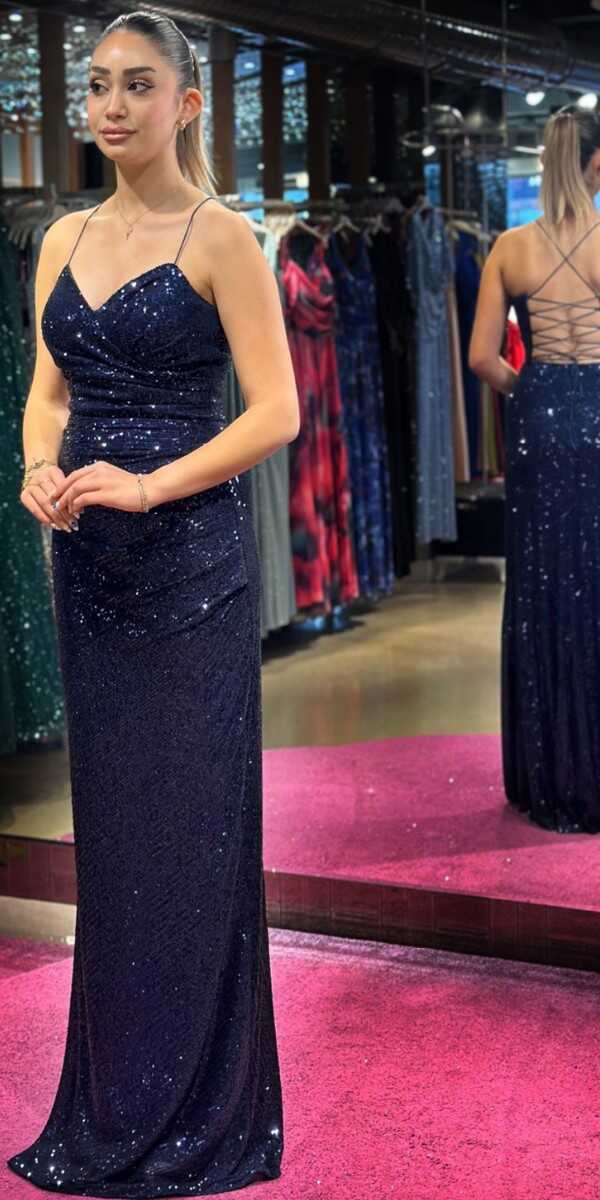 Lacivert Renk Düz Kesim Uzun Abiye Elbise, Payet Kumaştan Üretilmiş Olup Pırıltısıyla Göz Kamaştıracaktır. Elbisedeki İp Askılar Kullanım Kolaylığı Yaratacak. Şık Sırt Dekoltesi Size Çok Yakışacakır.