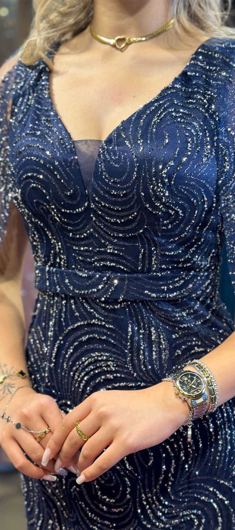 Lacivert Renk Düz Kesim Uzun Abiye Elbise, Simli Kumaştan Üretilmiş Olup Simlerin Işıltısıyla Çok Hoş Gözükeceksiniz.