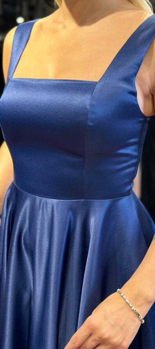 Lacivert Kalın Askı Kloş Etekli Saten Midi Abiye Elbise 7631