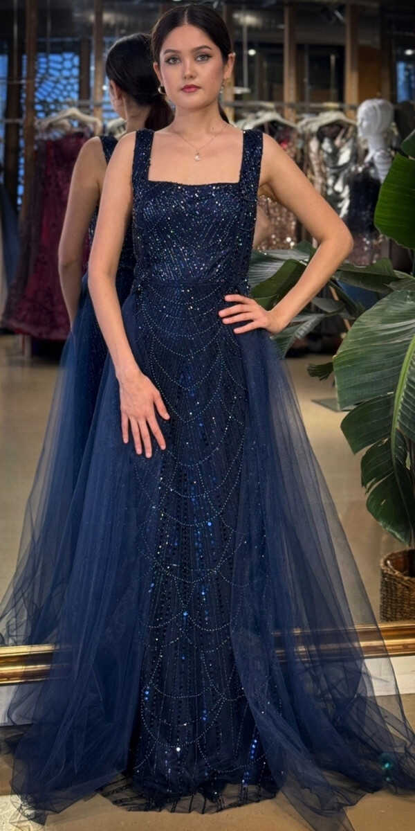 Gelince Haber VerKare Yaka Lacivert Renk Çıkarılabilir Kuyruk Uzun Abiye Elbise, Pullu Boncuklu Kumaştan Üretilmiş olup Parıltı ve Zarafetin Buluştuğu Kumaş Türü Sizi Işıl Işıl Gösterecektir. Kalın askılı yapısıyla destekleyici ve modern bir görünüm sağlar.