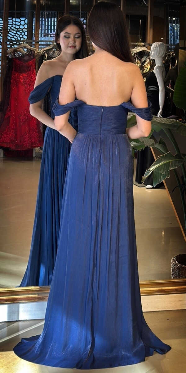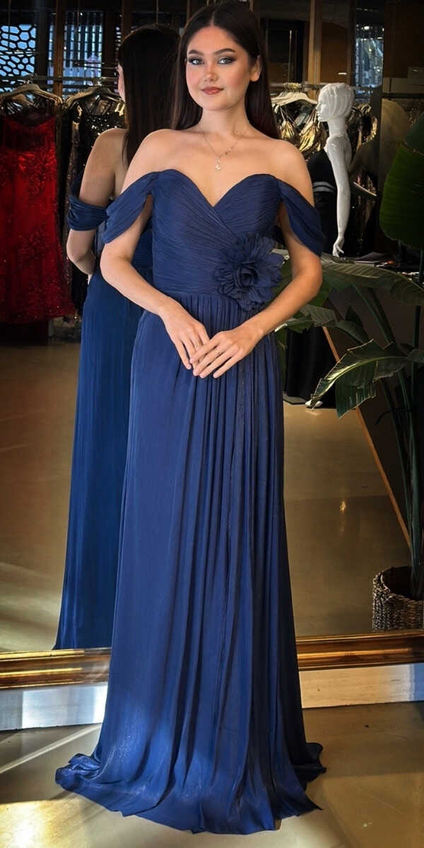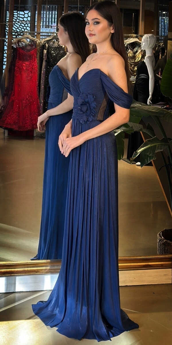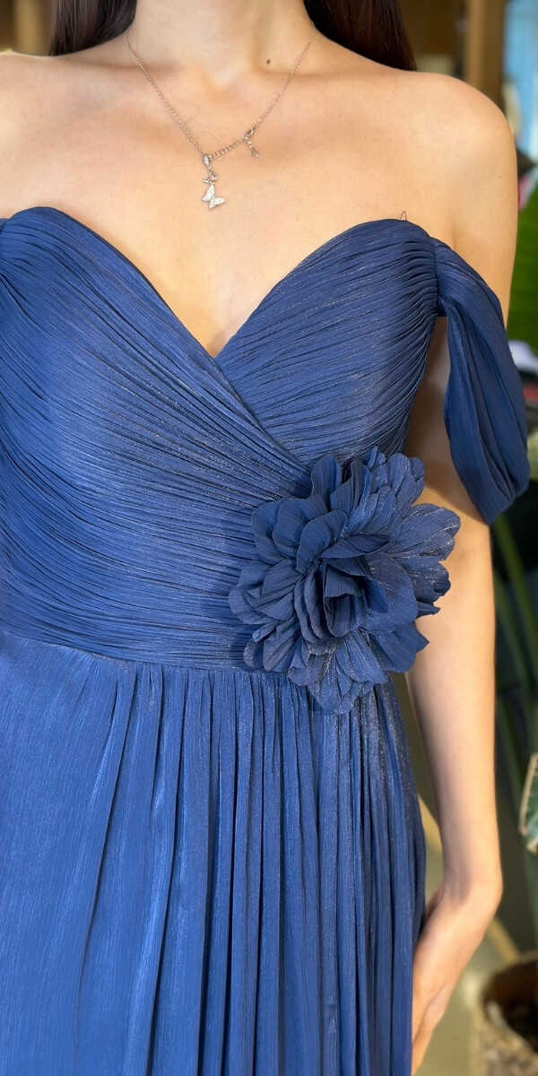 Gelince Haber VerMadonna Yaka Lacivert Renk Kloş Etekli Uzun Abiye Elbise, Tül Kumaştan Üretilmiş olup Hafif Olmasından Kaynaklı Sizi Gece Boyu Rahat Hissettirecek. Vücuda uyum sağlayan likralı kumaş, dinamik bir duruş kazandırır. Çiçek Detayı Modern Bir Görünüm Yaratacaktır.