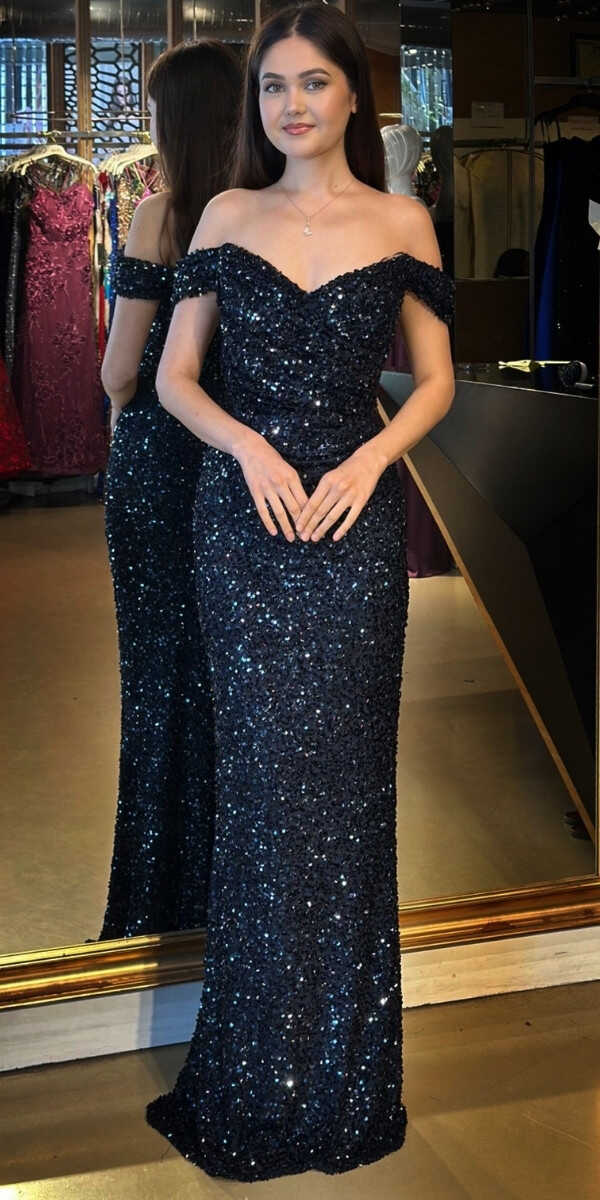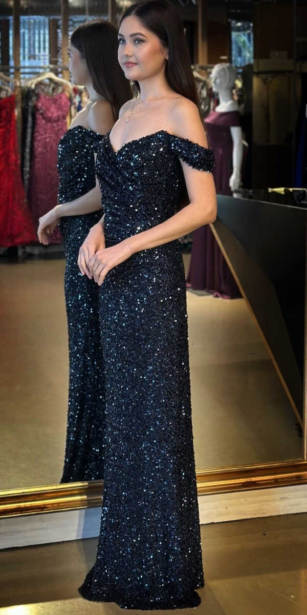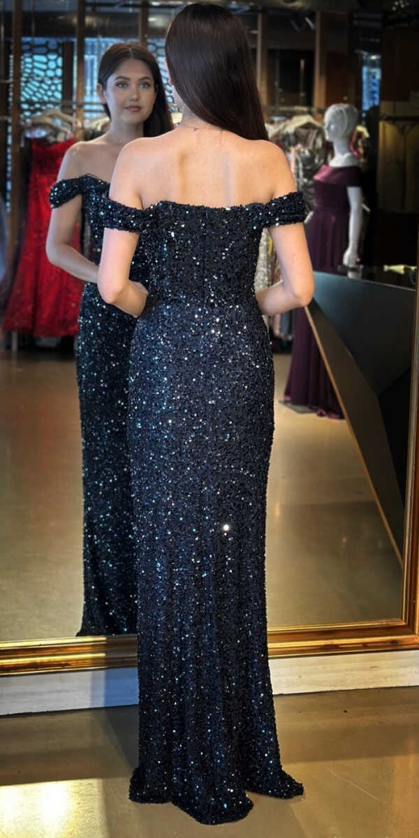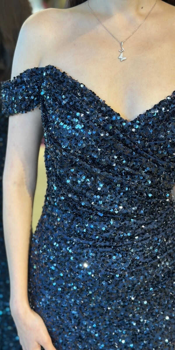 Lacivert Renk Düz Kesim Uzun Abiye Elbise, Payet Kumaştan Üretilmiş olup Pırıltısıyla Göz Kamaştıracaktır.