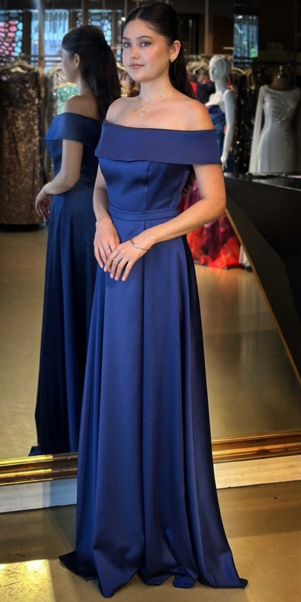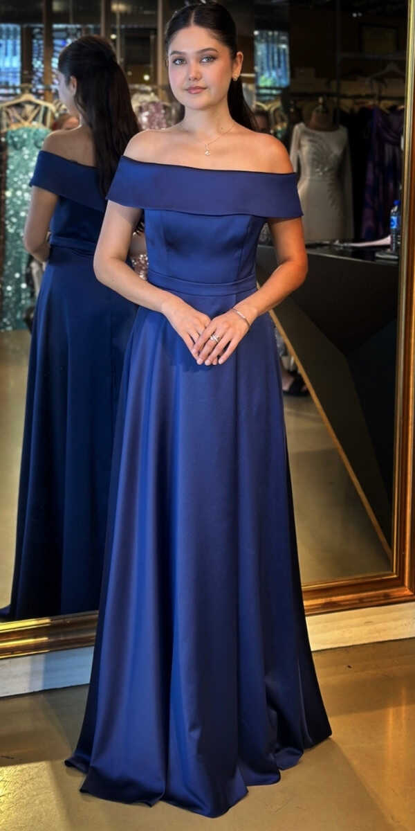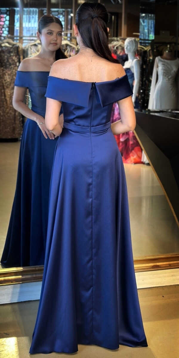 Lacivert Renk Kloş Etekli Uzun Abiye Elbise, Saten Kumaştan Üretilmiş olup Satenin Pürüzsüz Işığı Görünümünüze Zarafet Katacaktır.