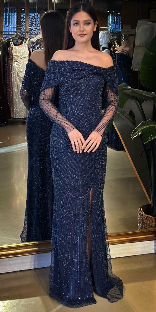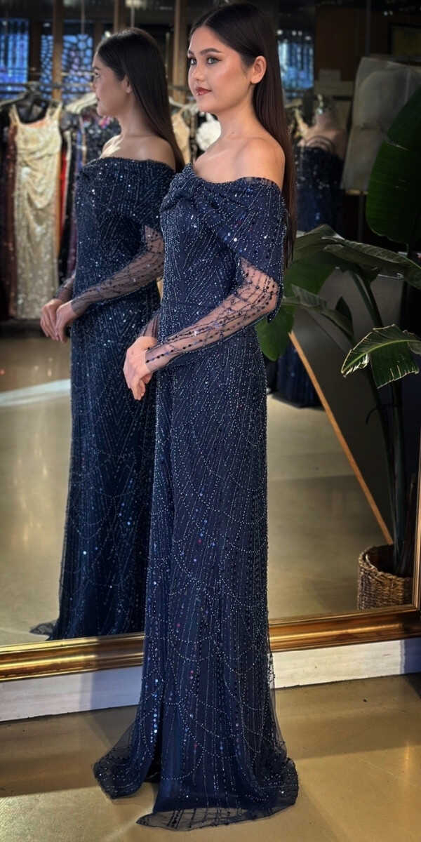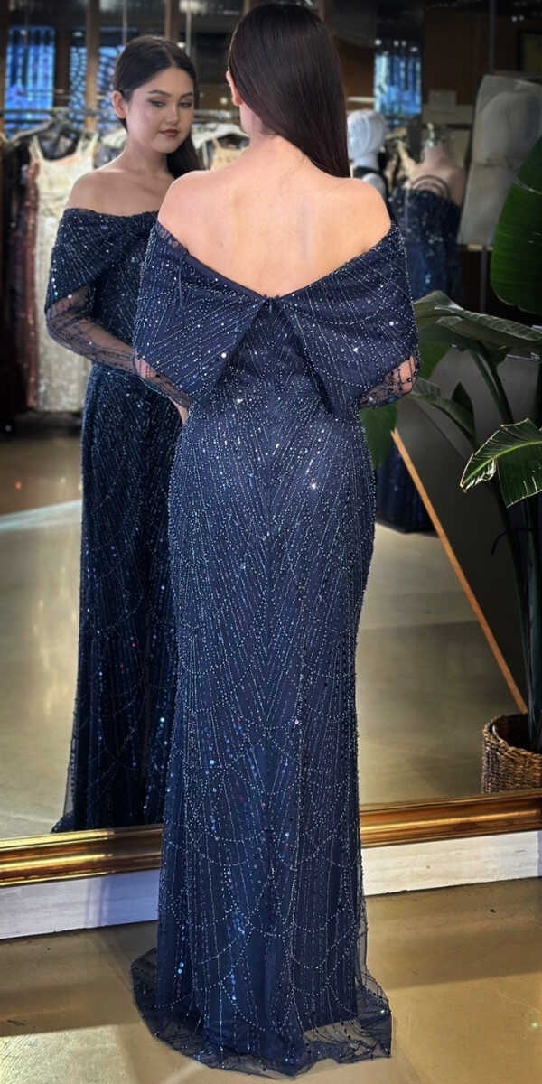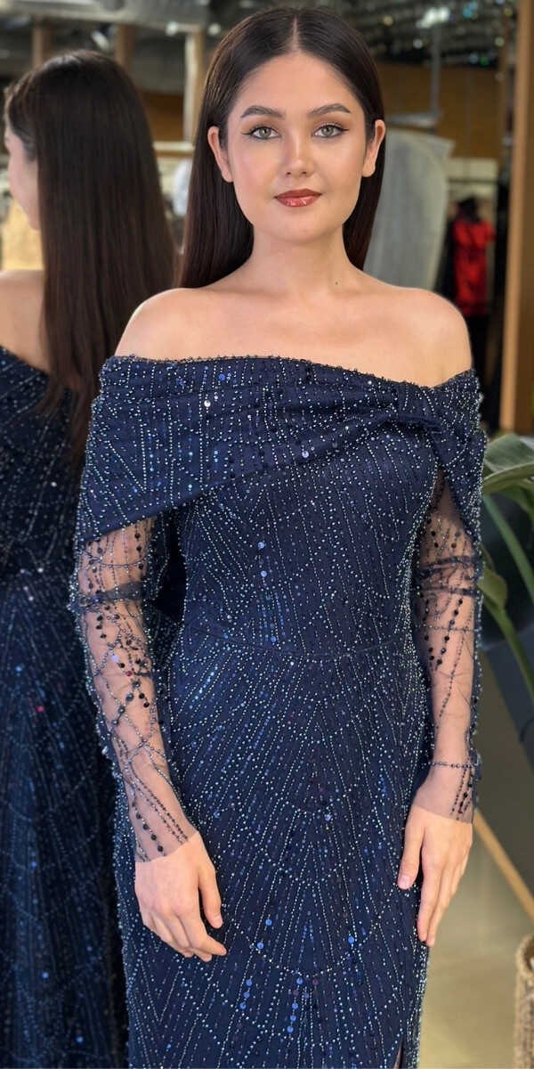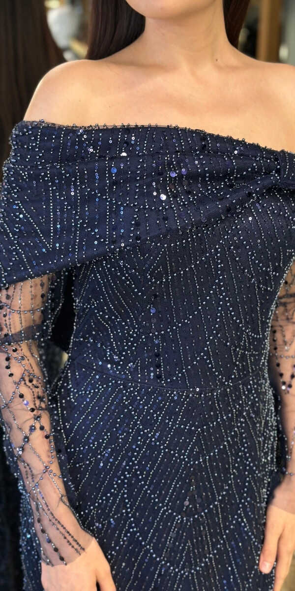 Gelince Haber VerMadonna Yaka Lacivert Renk Düz Kesim Uzun Abiye Elbise, Pullu Boncuklu Kumaştan Üretilmiş olup Parıltı ve Zarafetin Buluştuğu Kumaş Türü Sizi Işıl Işıl Gösterecektir. Uzun kollarıyla, kollarınızı zarif bir şekilde kapatır. Yırtmaç Detayı Cesur ve Çarpıcı Bir Stil Sunacaktır.