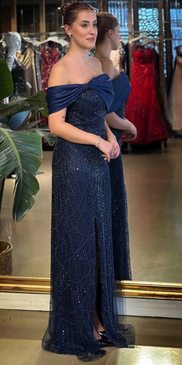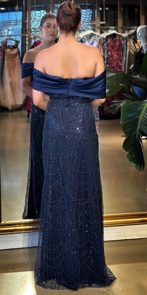 Gelince Haber VerMadonna Yaka Lacivert Renk Düz Kesim Uzun Abiye Elbise, Pullu Boncuklu Kumaştan Üretilmiş olup Parıltı ve Zarafetin Buluştuğu Kumaş Türü Sizi Işıl Işıl Gösterecektir. Vücuda uyum sağlayan likralı kumaş, dinamik bir duruş kazandırır. Yırtmaç Detayı Cesur ve Çarpıcı Bir Stil Sunacaktır.