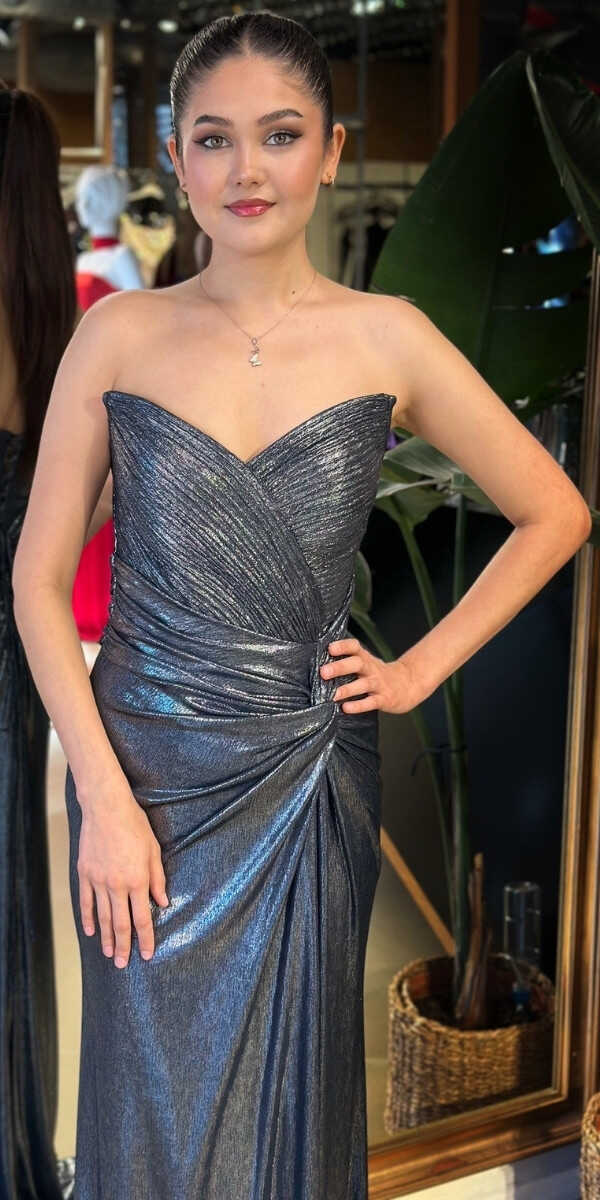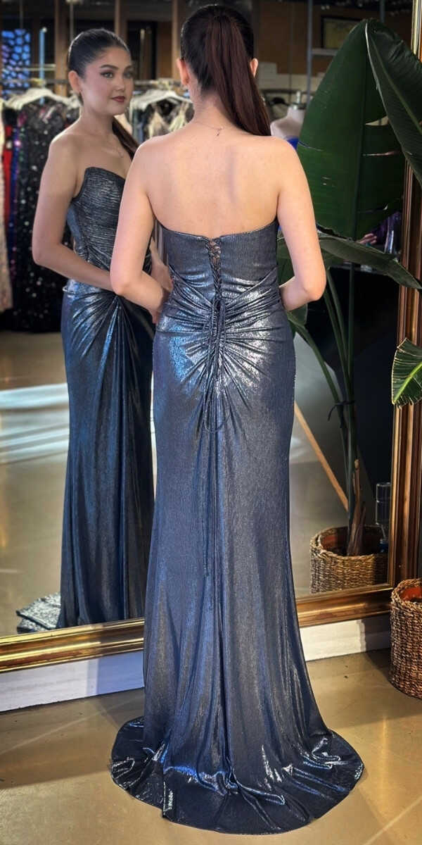 Straplez Yaka Lacivert Renk Düz Kesim Uzun Abiye Elbise, Parlak Kumaş Kumaştan Üretilmiş olup Parlak dokusu sayesinde her adımda ışıltınızı yansıtın. Şık Sırt Dekoltesi Size Çok Yakışacak.