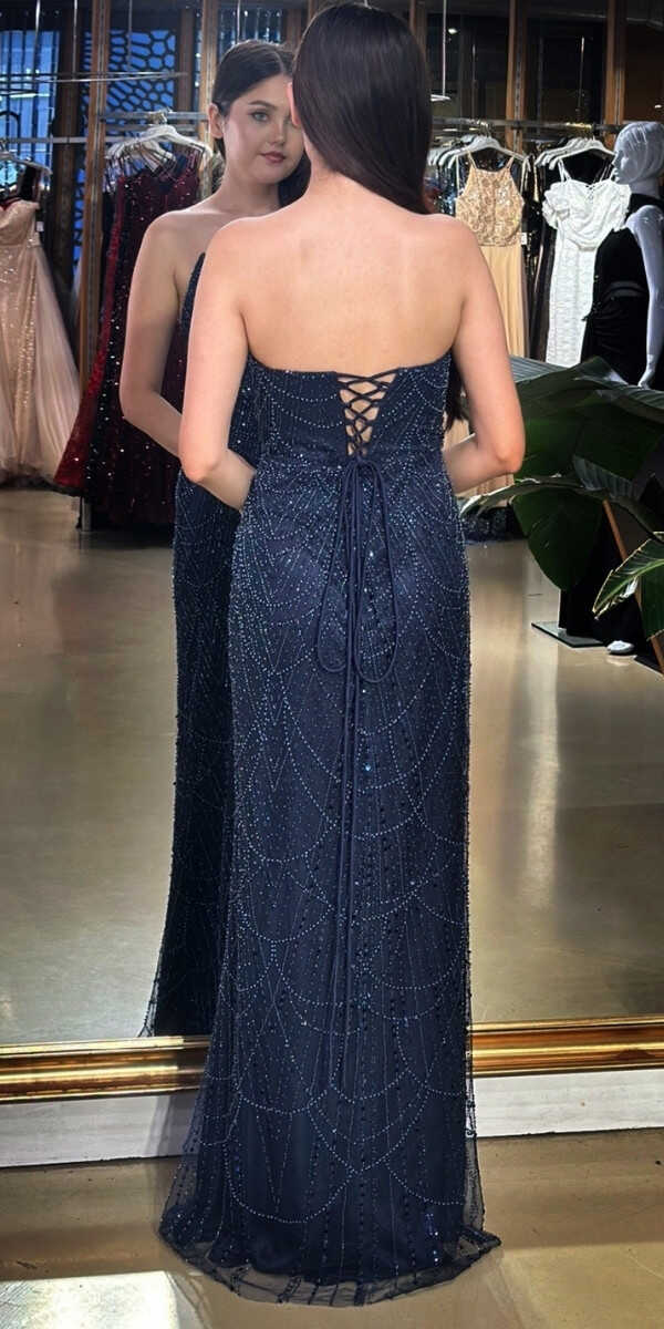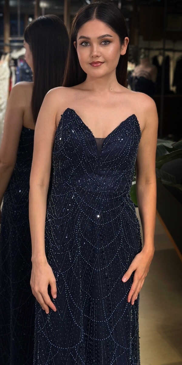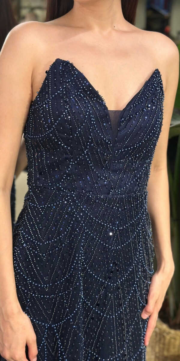 Straplez Yaka Lacivert Renk Düz Kesim Uzun Abiye Elbise, Pullu Boncuklu Kumaştan Üretilmiş olup Parıltı ve Zarafetin Buluştuğu Kumaş Türü Sizi Işıl Işıl Gösterecektir. Şık Sırt Dekoltesi Size Çok Yakışacak.