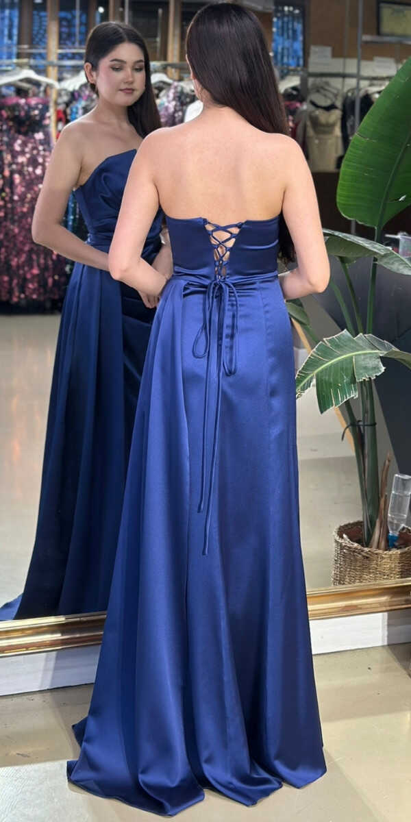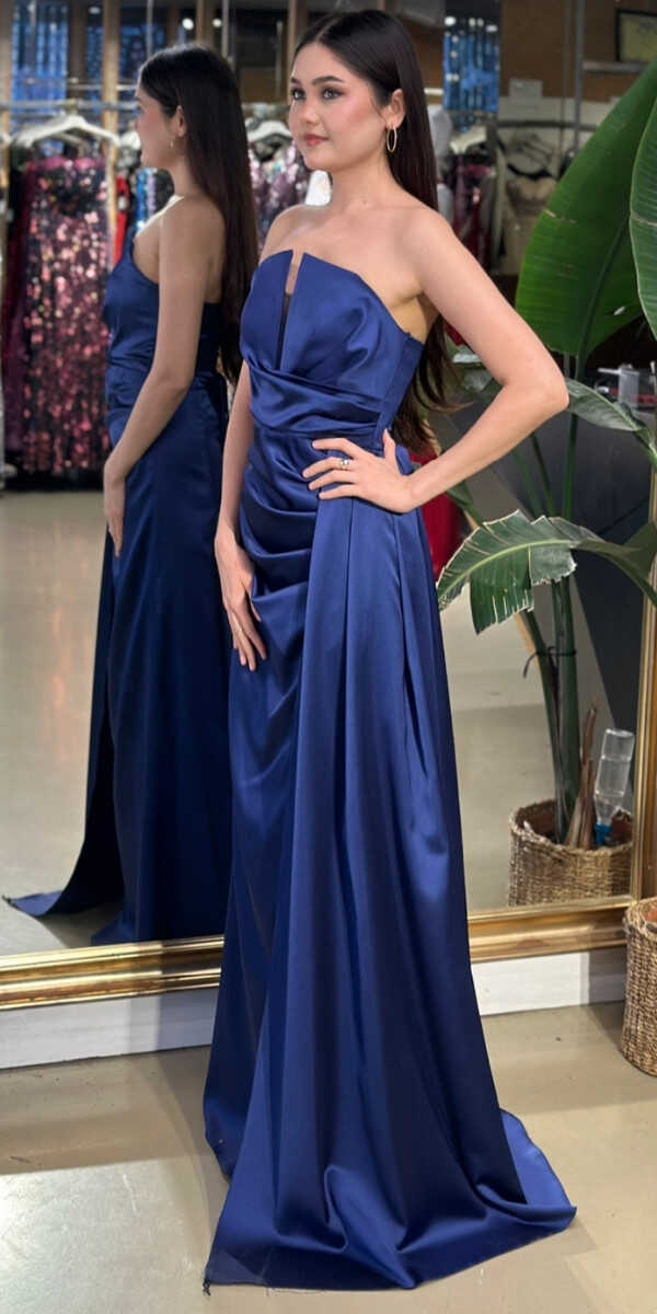 Straplez Yaka Lacivert Renk Düz Kesim Uzun Abiye Elbise, Saten Kumaştan Üretilmiş olup Satenin Pürüzsüz Işığı Görünümünüze Zarafet Katacaktır. Şık Sırt Dekoltesi Size Çok Yakışacak.