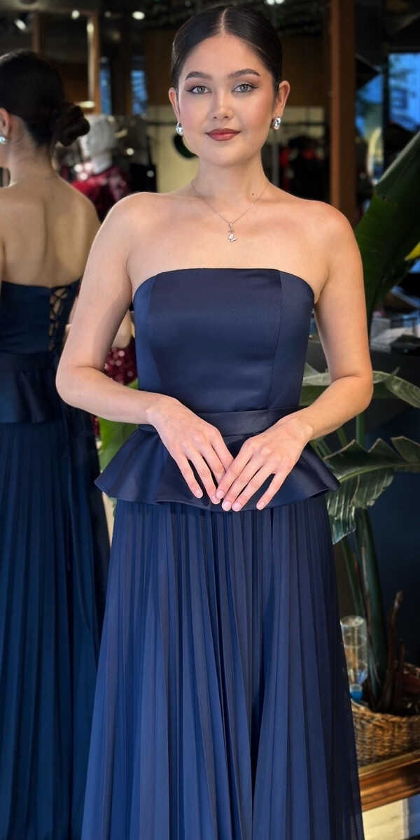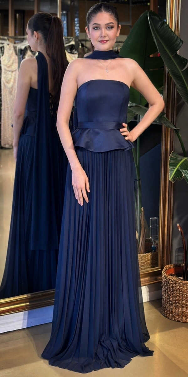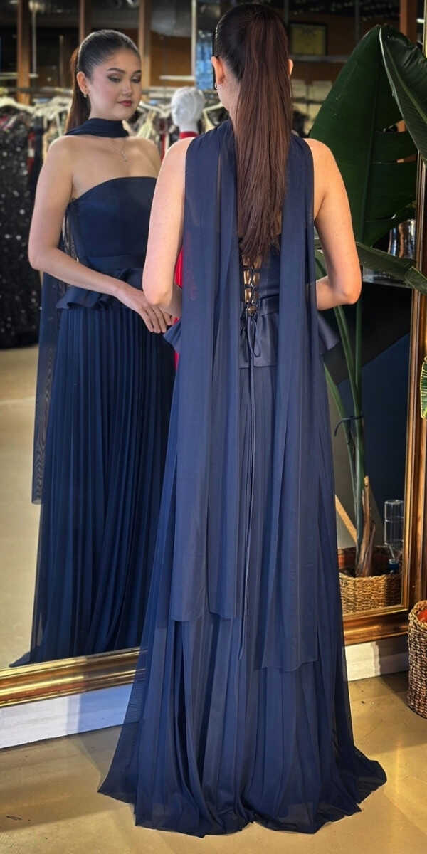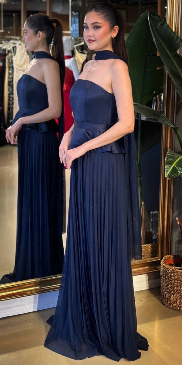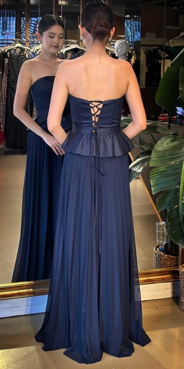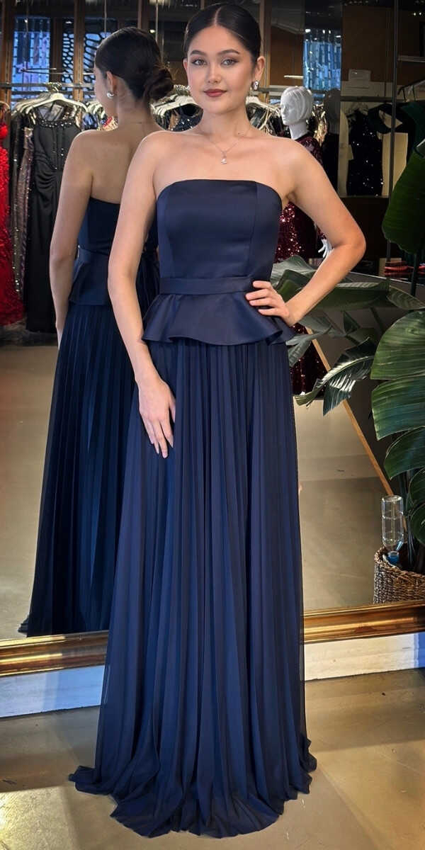 Straplez Yaka Lacivert Renk Kloş Etekli Uzun Abiye Elbise, Şifon Kumaştan Üretilmiş olup Uçuş Uçuş Şifon Kumaş Tüm Dikkatleri Üzerinize Toplayacaktır. Şık Sırt Dekoltesi Size Çok Yakışacak.