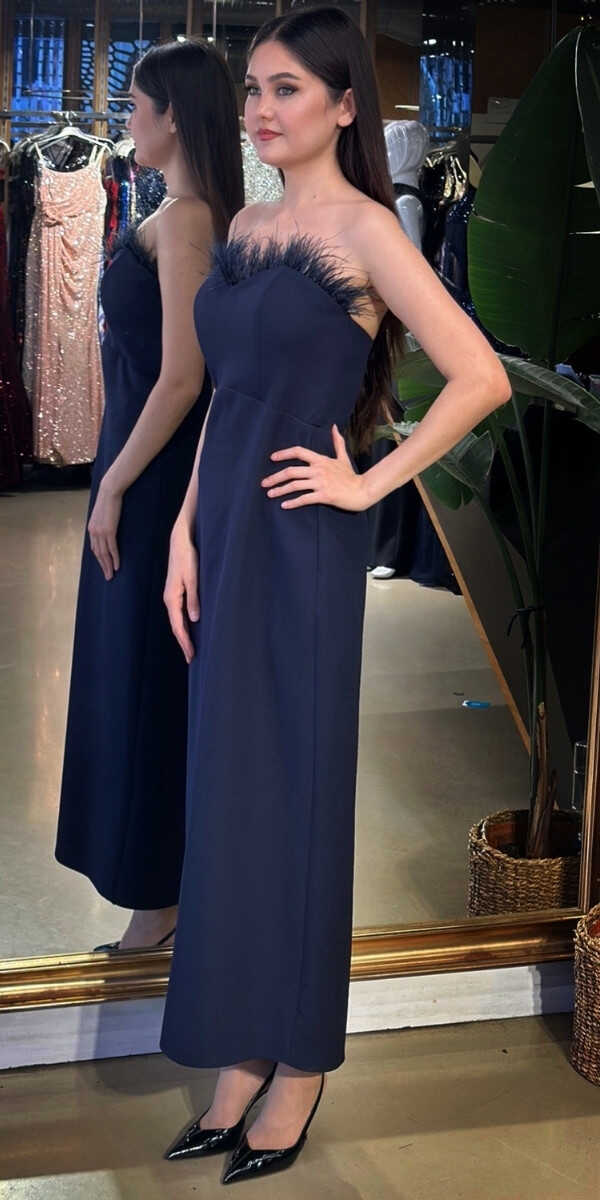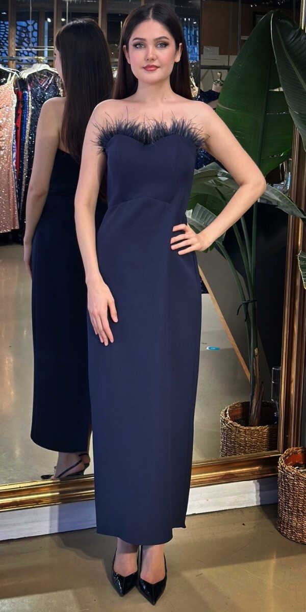 Gelince Haber VerStraplez Yaka Lacivert Renk Düz Kesim Midi Abiye Elbise, Krep Kumaştan Üretilmiş olup Hafif Ve Daha Az Kırışan Krep Kumaş Sizi Daha Rahat Hissettirecektir. Vücuda uyum sağlayan likralı kumaş, dinamik bir duruş kazandırır. Uçuşan Tüy Detay Sizi Oldukça Havalı Gösterecek. Yırtmaç Detayı Cesur ve Çarpıcı Bir Stil Sunacaktır.