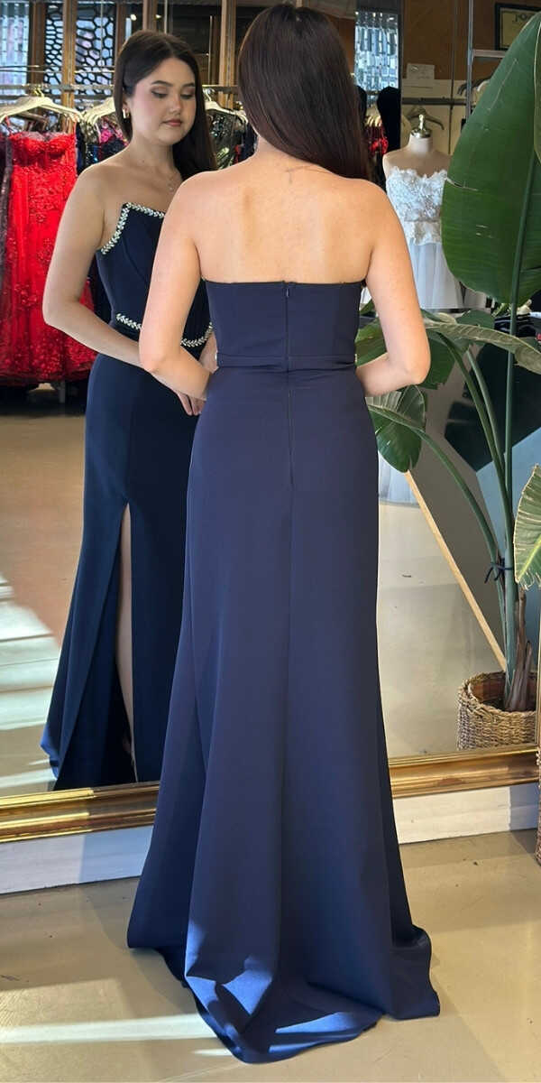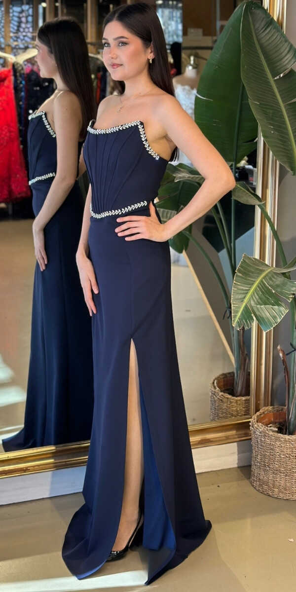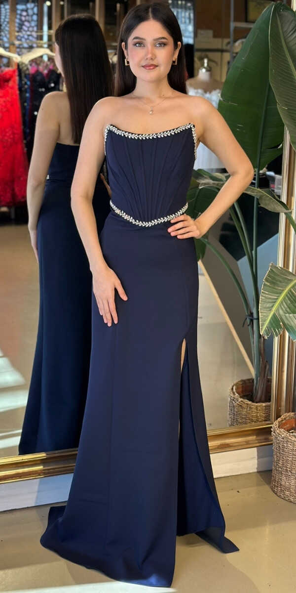 Straplez Yaka Lacivert Renk Düz Kesim Uzun Abiye Elbise, Krep Kumaştan Üretilmiş olup Hafif Ve Daha Az Kırışan Krep Kumaş Sizi Daha Rahat Hissettirecektir. Yırtmaç Detayı Cesur ve Çarpıcı Bir Stil Sunacaktır.