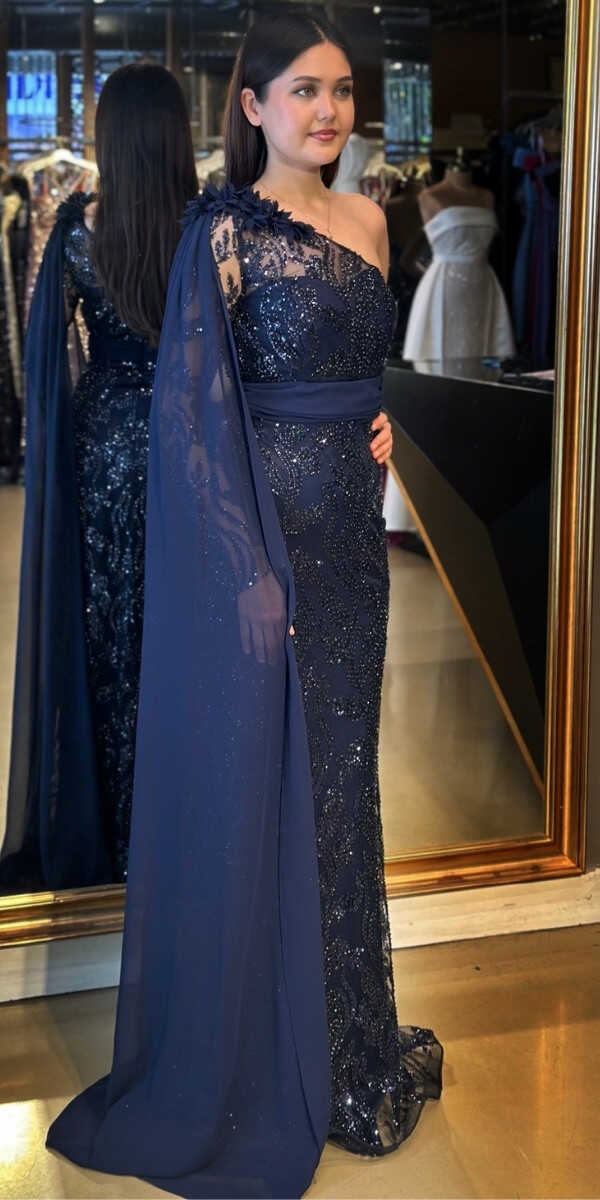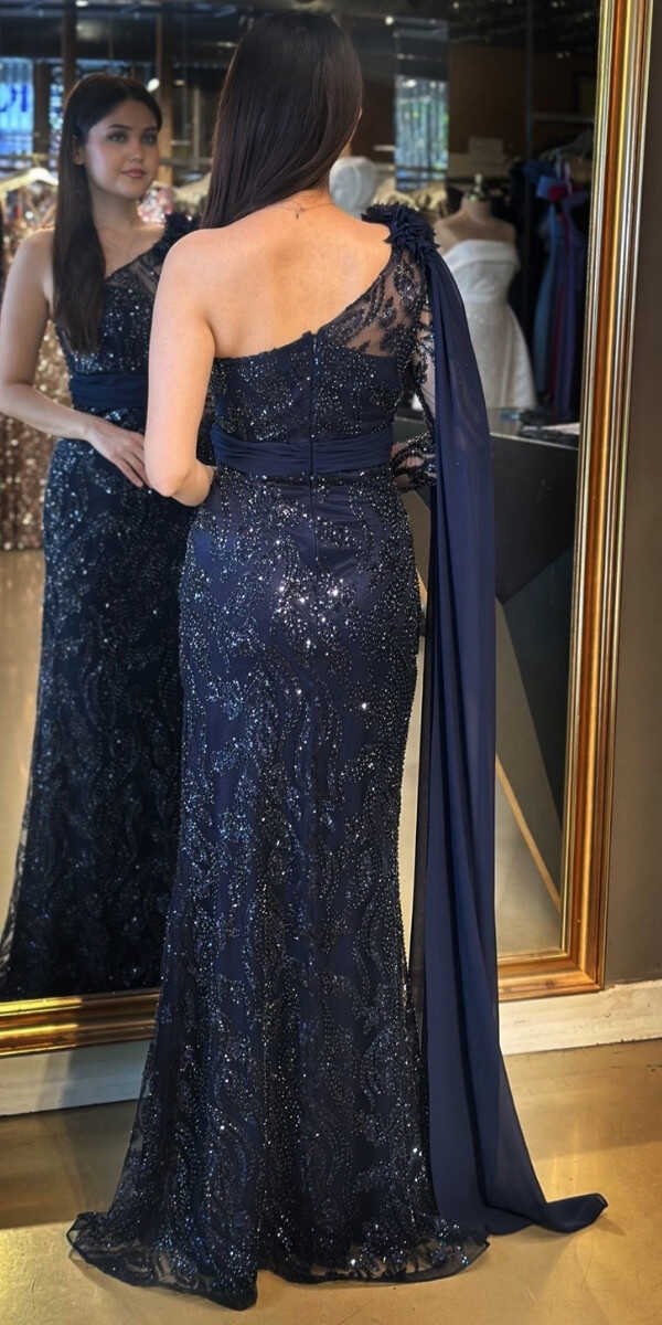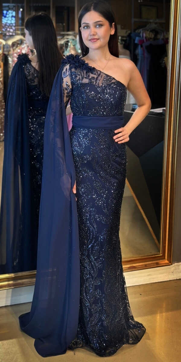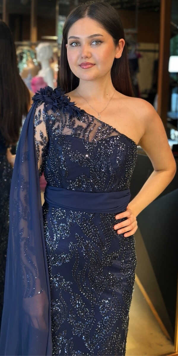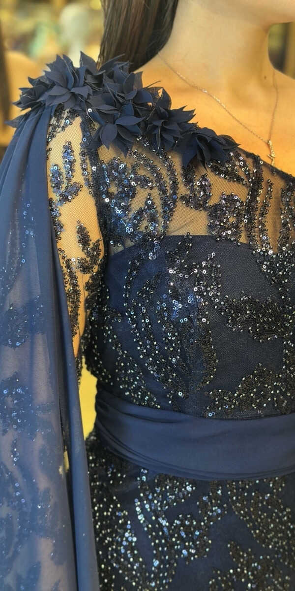 Lacivert Renk Düz Kesim Uzun Abiye Elbise, Pullu Boncuklu Kumaştan Üretilmiş olup Parıltı ve Zarafetin Buluştuğu Kumaş Türü Sizi Işıl Işıl Gösterecektir. Çiçek Detayı Modern Bir Görünüm Yaratacaktır..