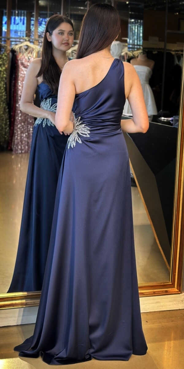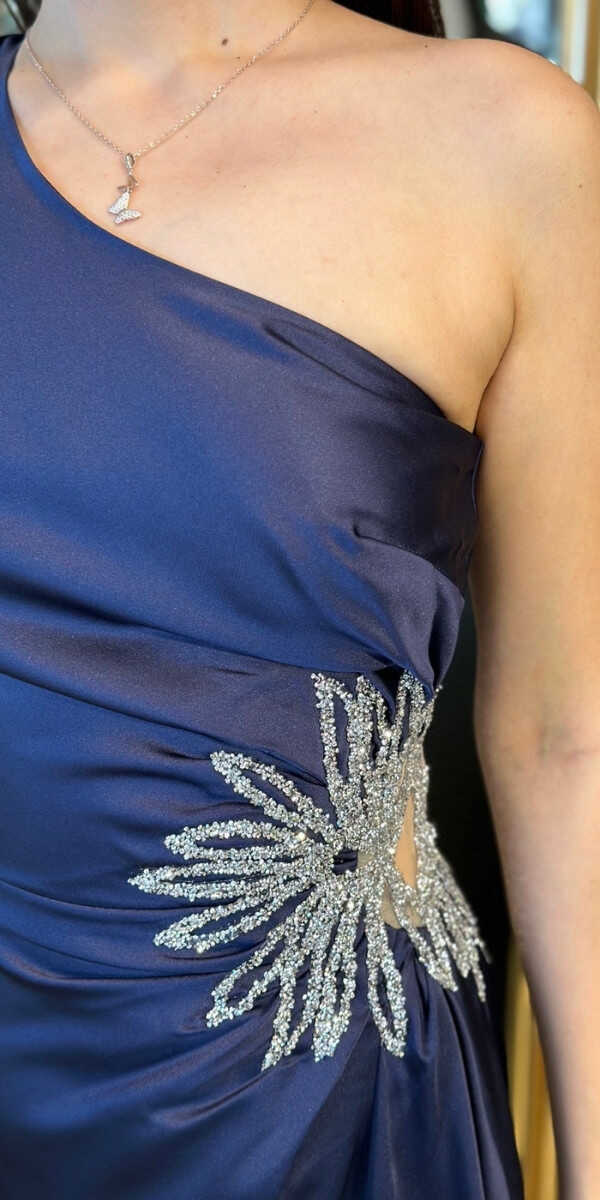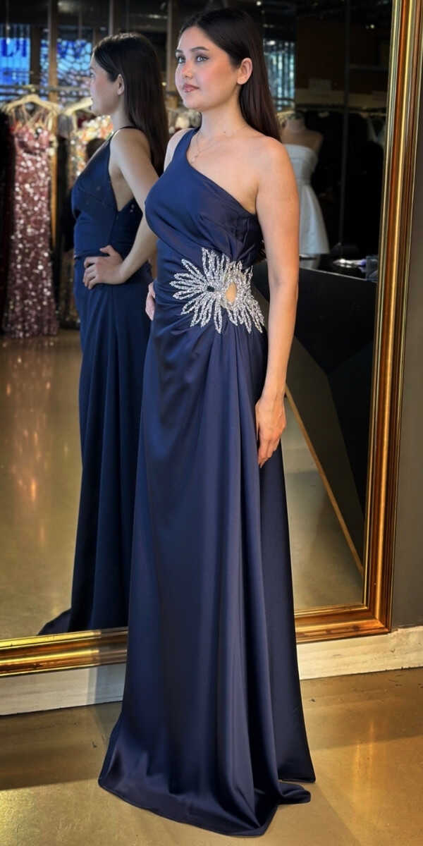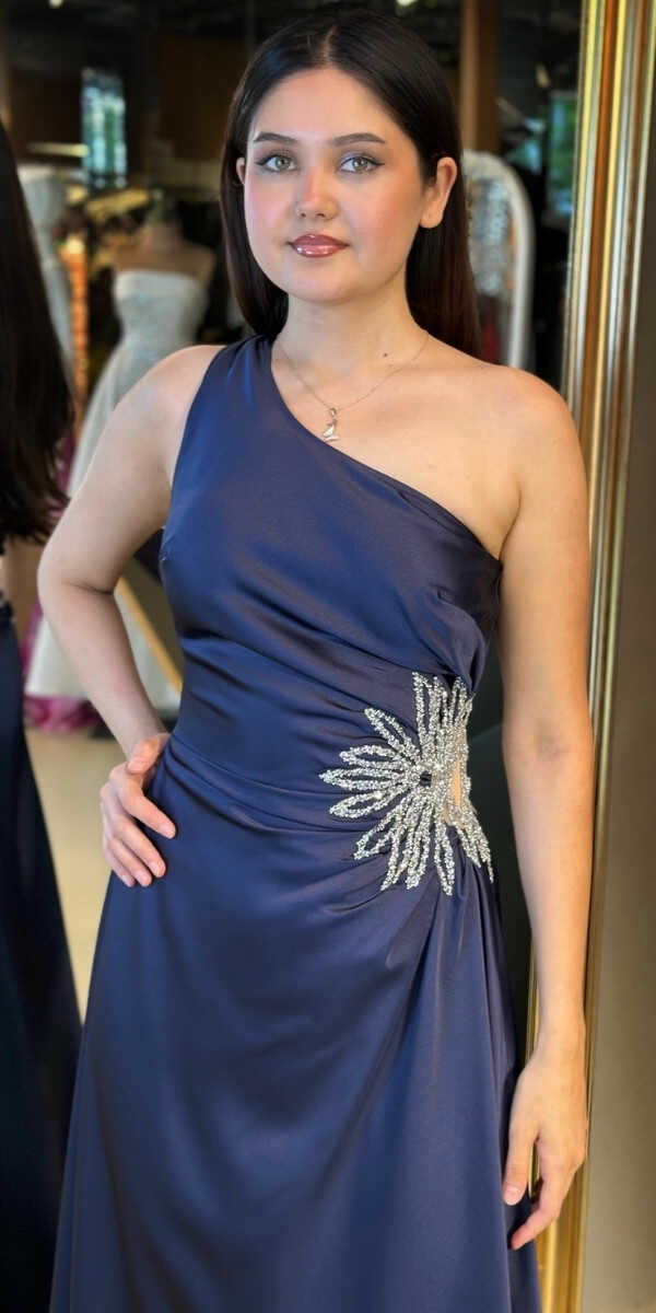 Lacivert Renk Düz Kesim Uzun Abiye Elbise, Saten Kumaştan Üretilmiş olup Satenin Pürüzsüz Işığı Görünümünüze Zarafet Katacaktır. Taşlı Aksesuar Dikkatleri Üzerinizde Toplayacak.