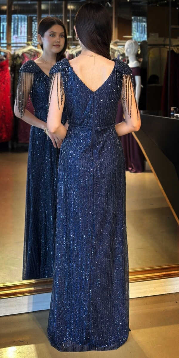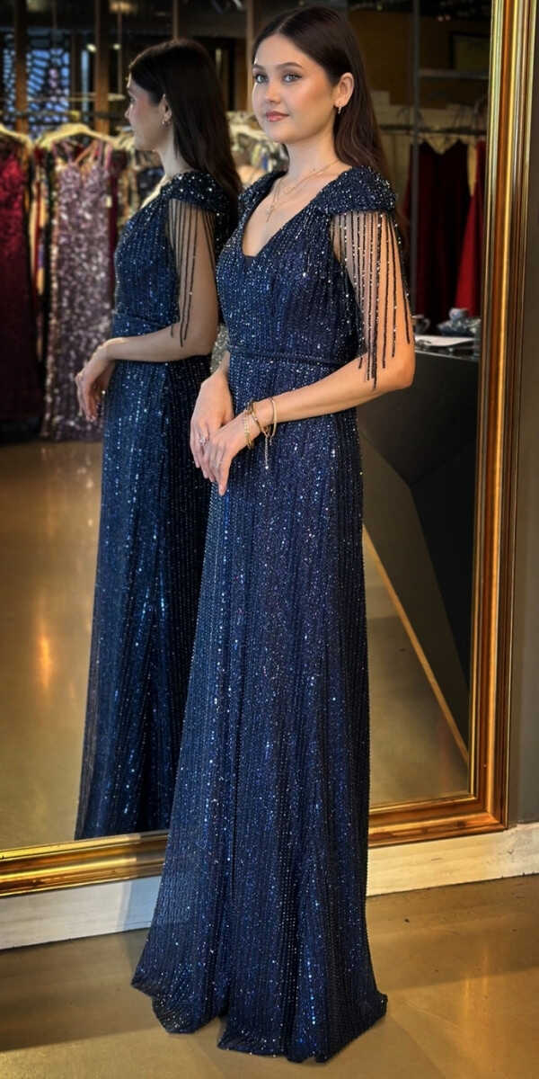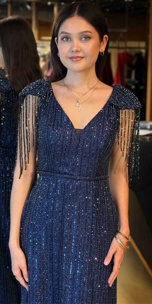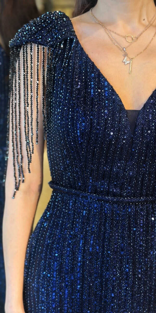Gelince Haber VerV Yaka Lacivert Renk Düz Kesim Uzun Abiye Elbise, Payet Kumaştan Üretilmiş olup Pırıltısıyla Göz Kamaştıracaktır. Vücuda uyum sağlayan likralı kumaş, dinamik bir duruş kazandırır. Boncuk süslemeleriyle her adımda ışıldar. Yırtmaç Detayı Cesur ve Çarpıcı Bir Stil Sunacaktır.