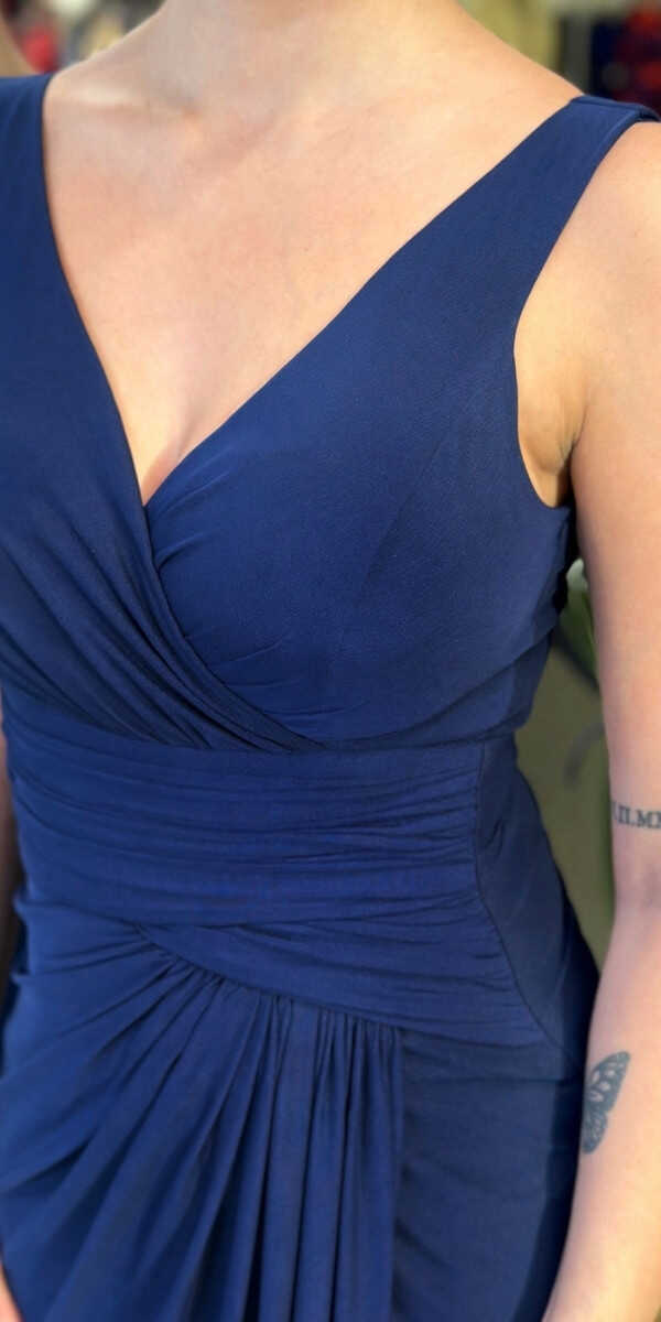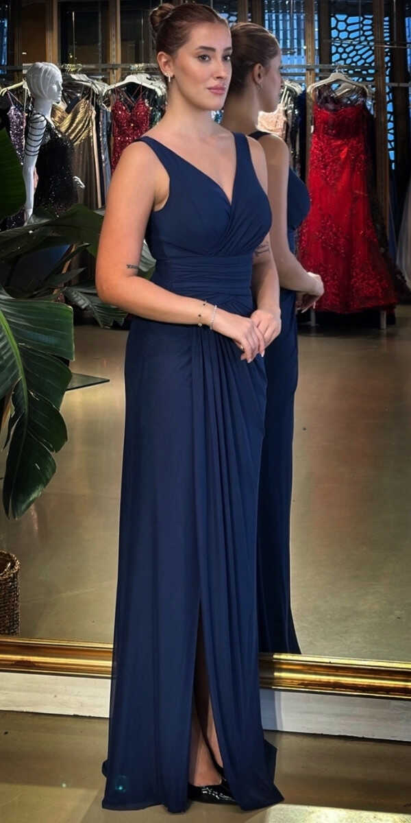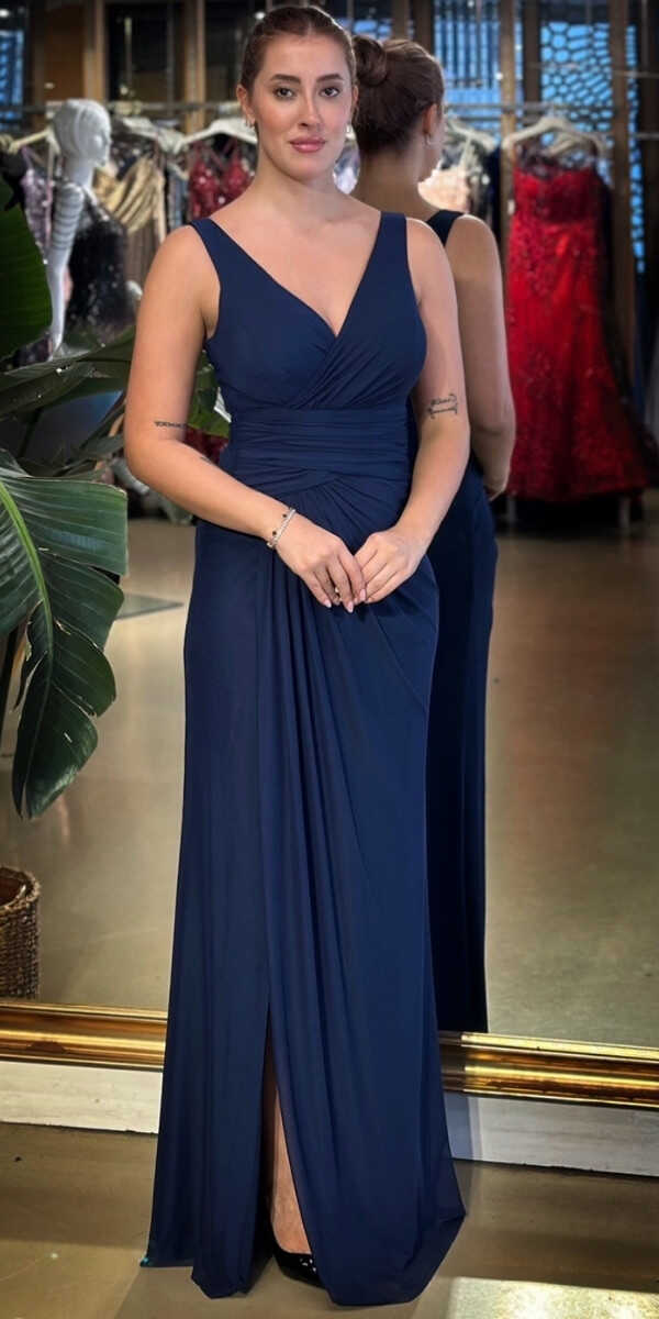 V Yaka Lacivert Renk Düz Kesim Uzun Abiye Elbise, Tül Kumaştan Üretilmiş olup Hafif Olmasından Kaynaklı Sizi Gece Boyu Rahat Hissettirecek. Vücuda uyum sağlayan likralı kumaş, dinamik bir duruş kazandırır. Kalın askılı yapısıyla destekleyici ve modern bir görünüm sağlar. Adeta Göz Kamaştıran Bir Görünüm Yaratacak.