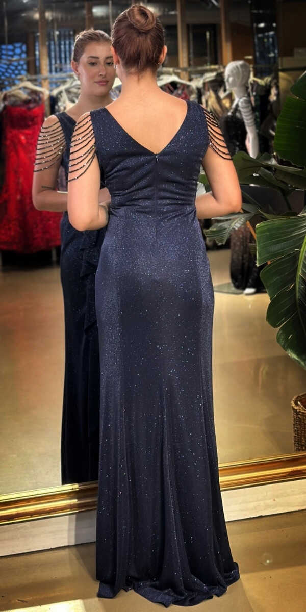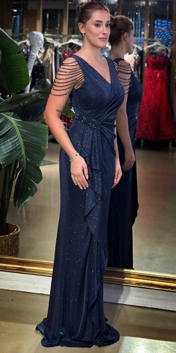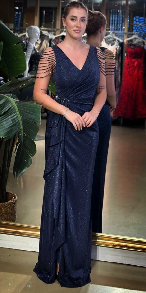 V Yaka Lacivert Renk Düz Kesim Uzun Abiye Elbise, Simli Kumaştan Üretilmiş olup Simlerin Işıltısıyla Çok Hoş Gözükeceksiniz. Kalın askılı yapısıyla destekleyici ve modern bir görünüm sağlar. Boncuk süslemeleriyle her adımda ışıldar. Adeta Göz Kamaştıran Bir Görünüm Yaratacak.