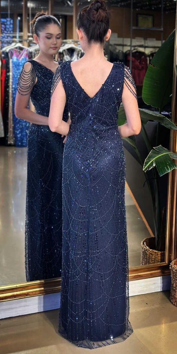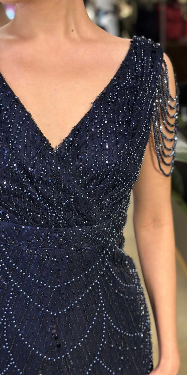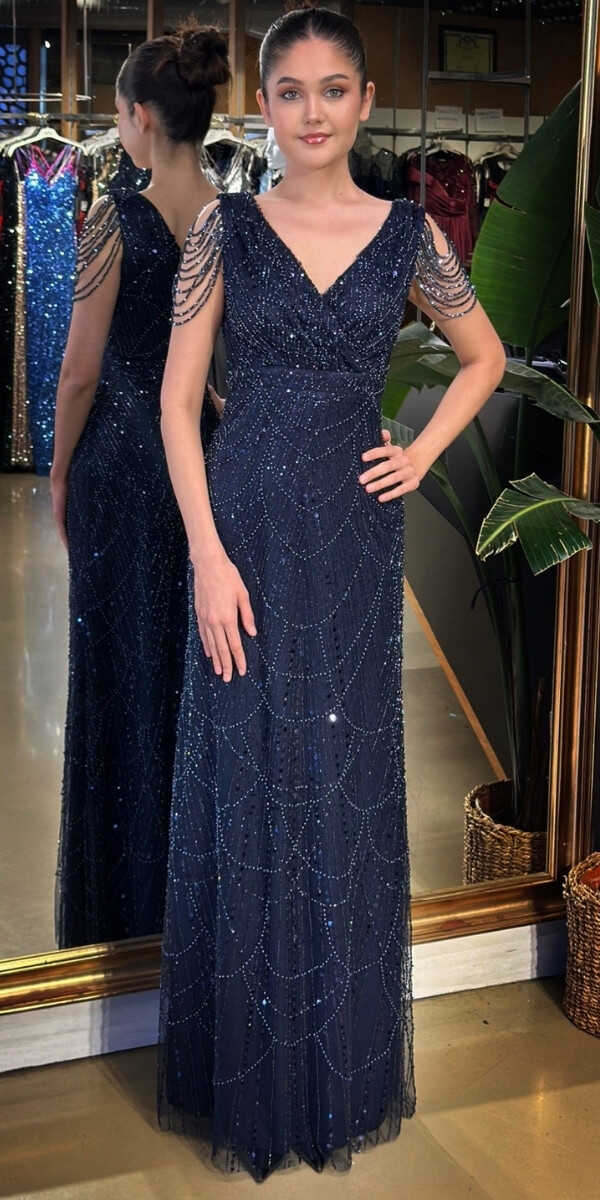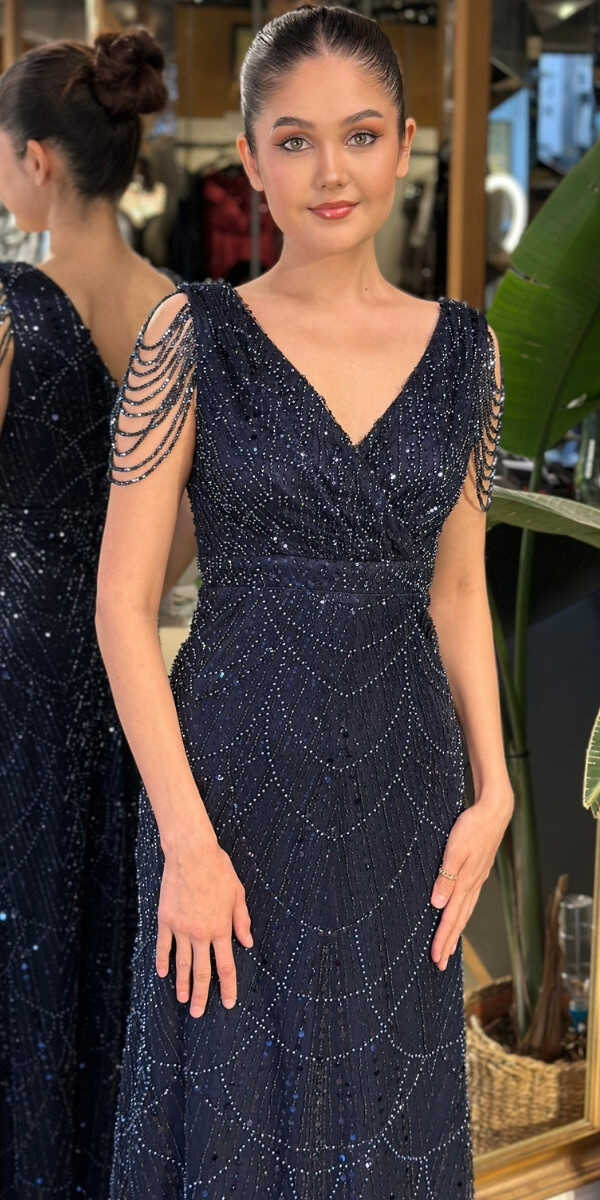 Notify me when its in stockV Yaka Lacivert Renk Düz Kesim Uzun Abiye Elbise, Pullu Boncuklu Kumaştan Üretilmiş olup Parıltı ve Zarafetin Buluştuğu Kumaş Türü Sizi Işıl Işıl Gösterecektir. Kalın askılı yapısıyla destekleyici ve modern bir görünüm sağlar. Boncuk süslemeleriyle her adımda ışıldar.