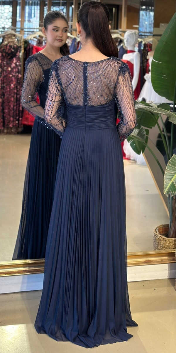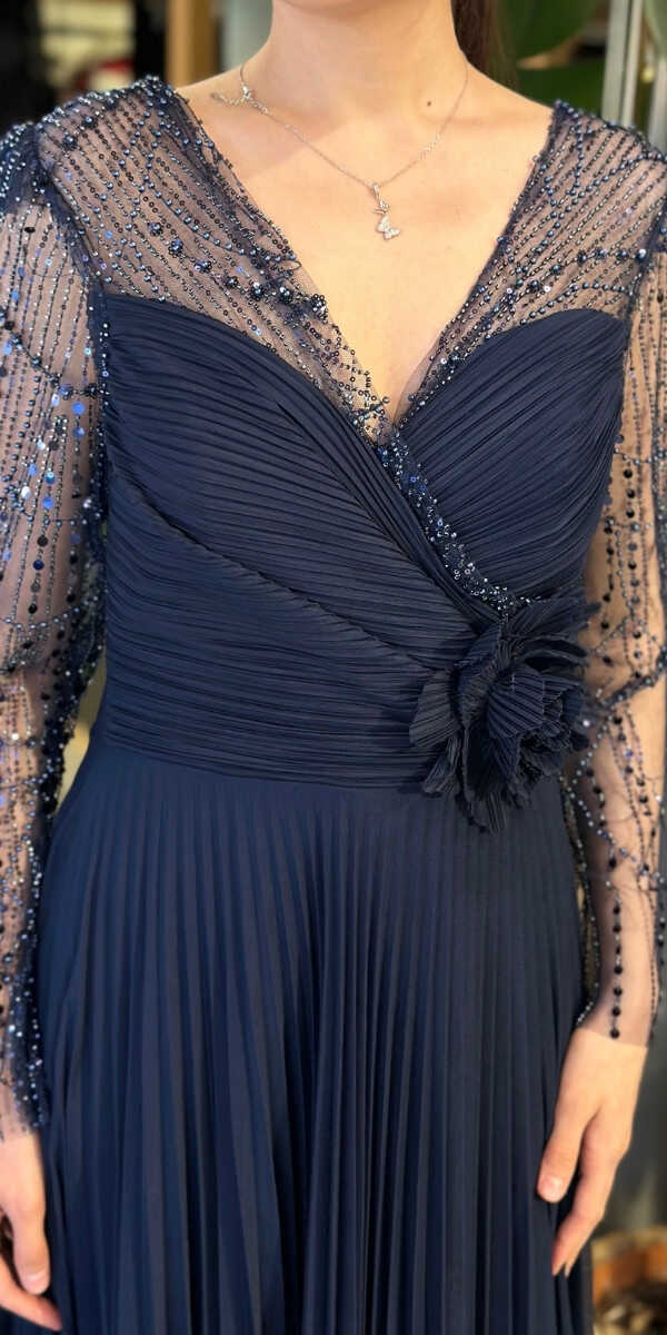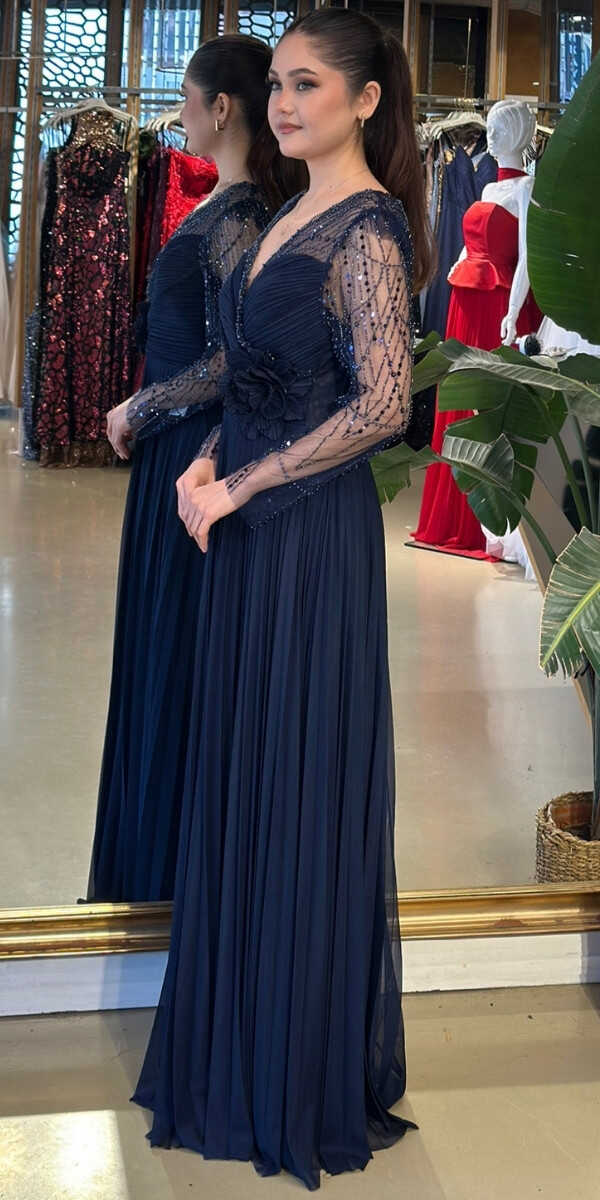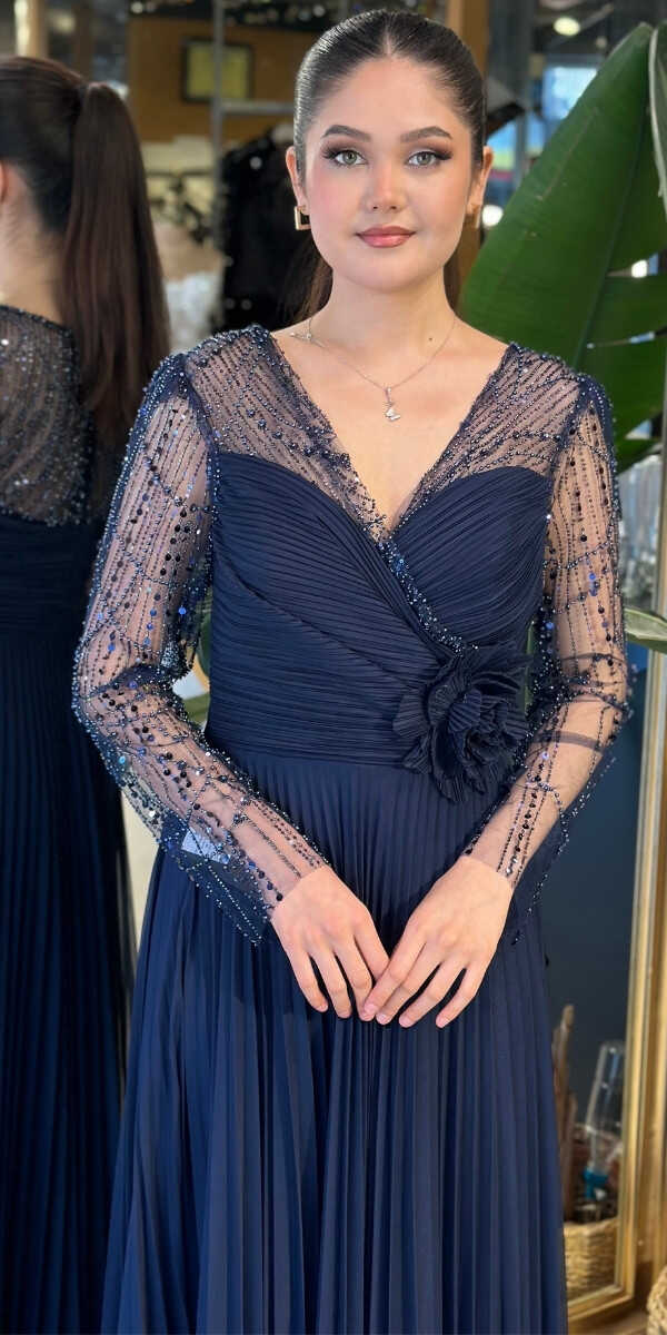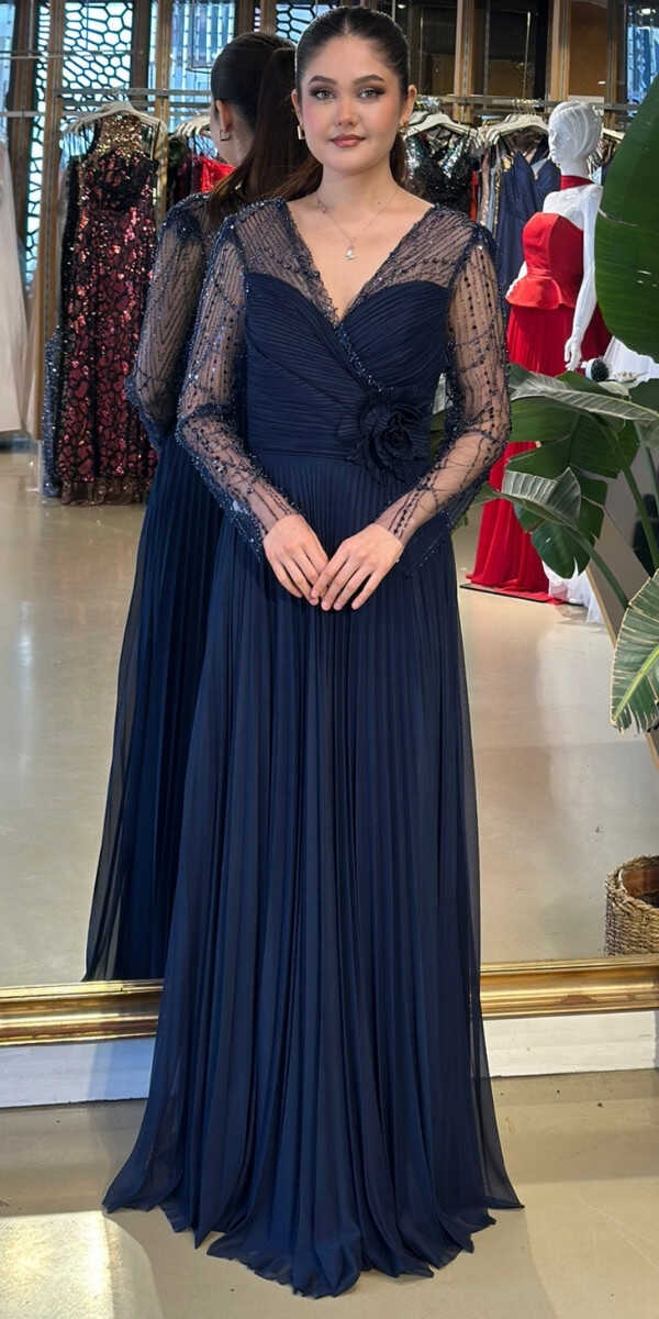 Gelince Haber VerV Yaka Lacivert Renk Kloş Etekli Uzun Abiye Elbise, Şifon Kumaştan Üretilmiş olup Uçuş Uçuş Şifon Kumaş Tüm Dikkatleri Üzerinize Toplayacaktır. Uzun kollarıyla, kollarınızı zarif bir şekilde kapatır. Çiçek Detayı Modern Bir Görünüm Yaratacaktır.