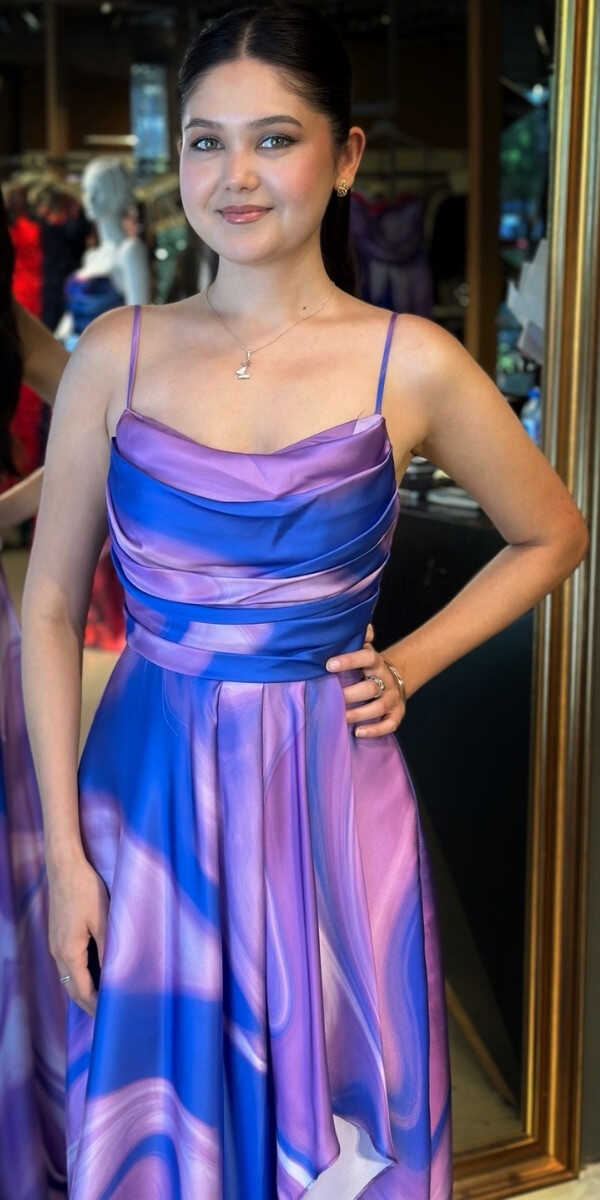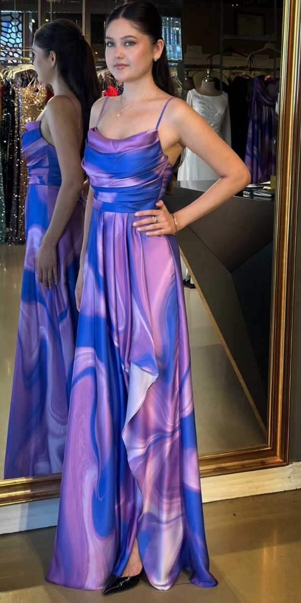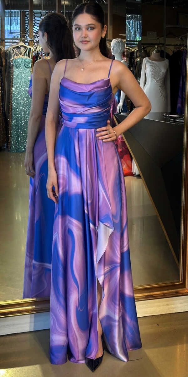 Lavanta Renk Kloş Etekli Uzun Abiye Elbise, Saten Kumaştan Üretilmiş olup Satenin Pürüzsüz Işığı Görünümünüze Zarafet Katacaktır. Elbisedeki İp Askılar Kullanım Kolaylığı Yaratacaktır. Şık Sırt Dekoltesi Size Çok Yakışacak. Yırtmaç Detayı Cesur ve Çarpıcı Bir Stil Sunacaktır.