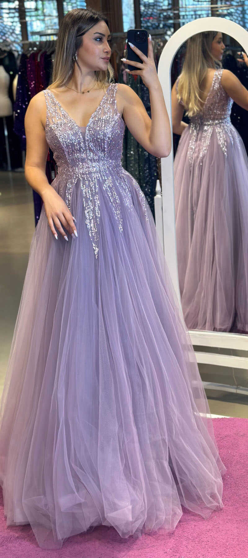 Lavanta Renk Kloş Etekli Uzun Abiye Elbise, Tül Kumaştan Üretilmiş Olup Hafif Olmasından Kaynaklı Sizi Gece Boyu Rahat Hissettirecek.