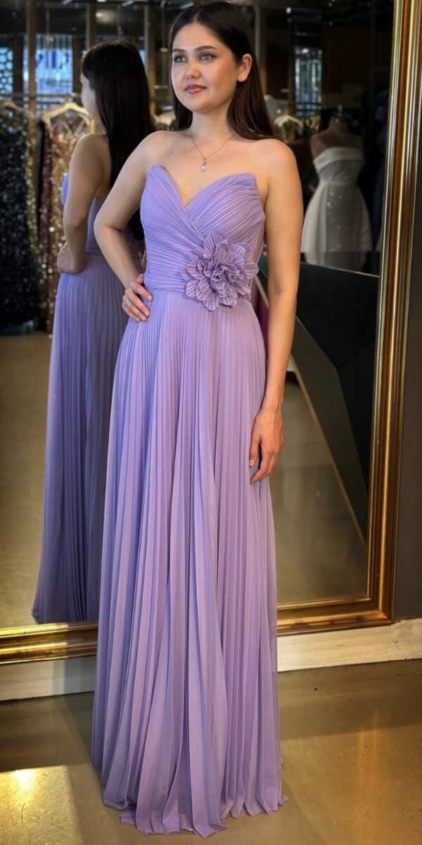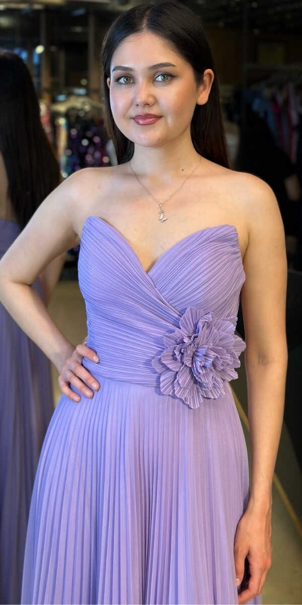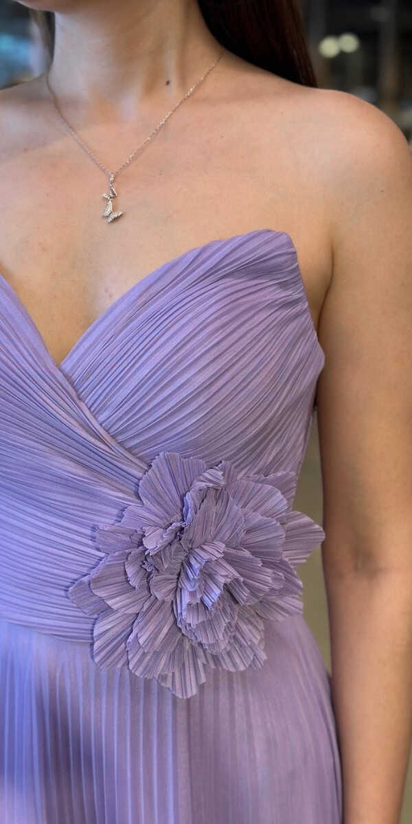 Lila Renk Kloş Etekli Uzun Abiye Elbise, Tül Kumaştan Üretilmiş olup Hafif Olmasından Kaynaklı Sizi Gece Boyu Rahat Hissettirecek. Çiçek Detayı Modern Bir Görünüm Yaratacaktır..