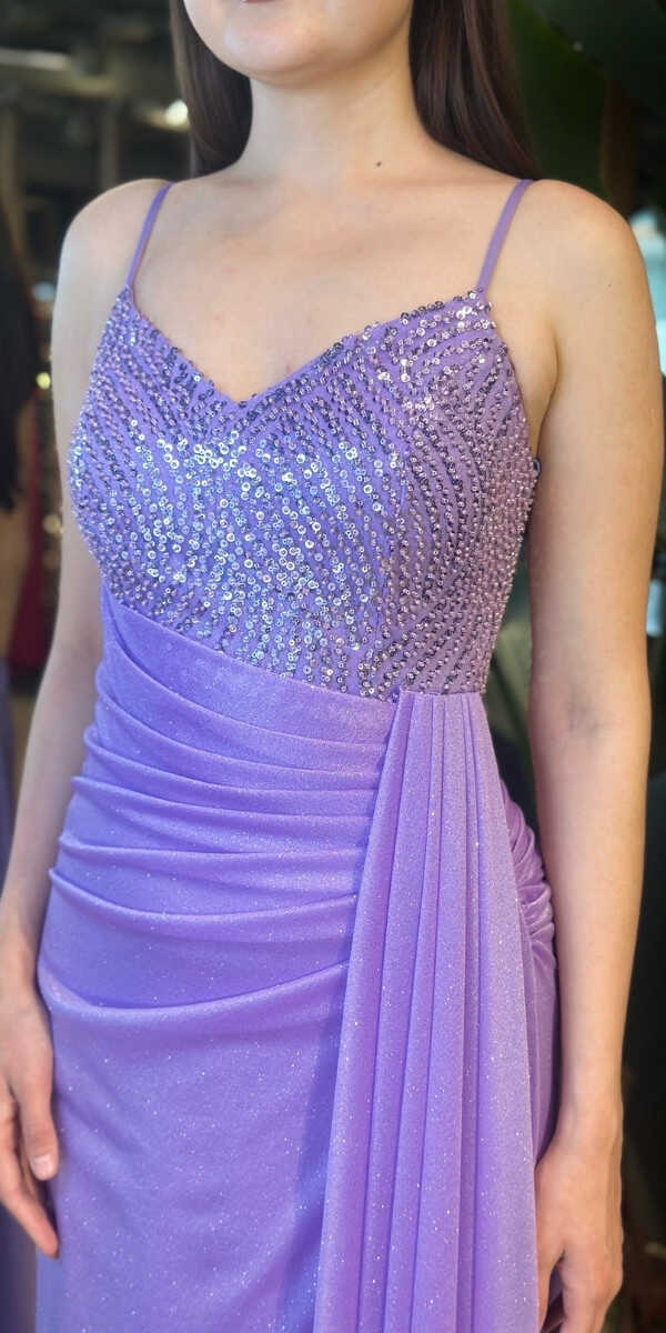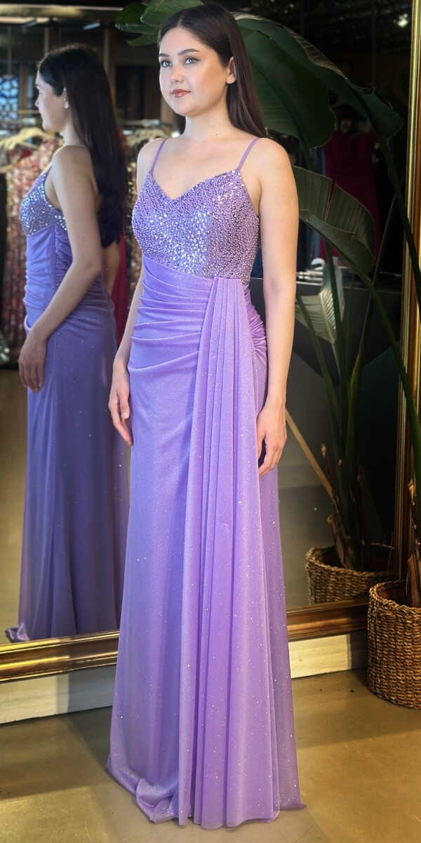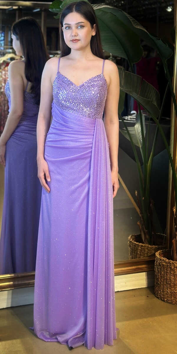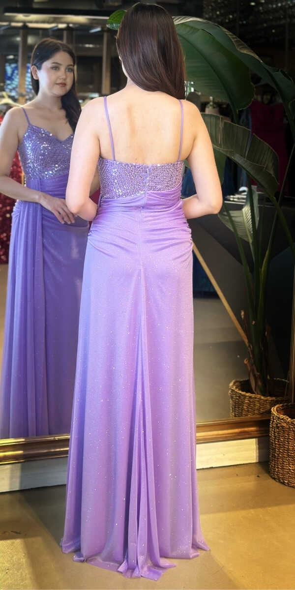 Lila Renk Düz Kesim Uzun Abiye Elbise, Simli Kumaştan Üretilmiş olup Simlerin Işıltısıyla Çok Hoş Gözükeceksiniz Elbisedeki İp Askılar Kullanım Kolaylığı Yaratacaktır.