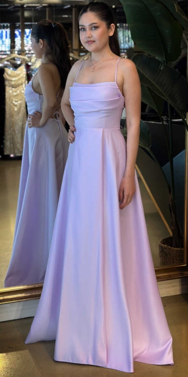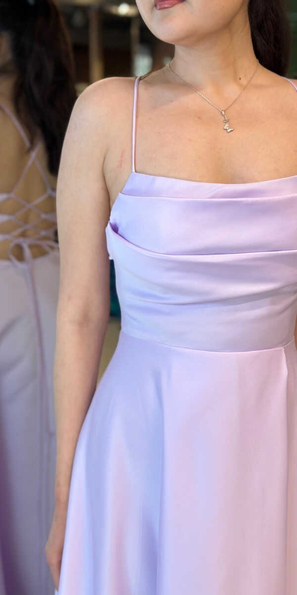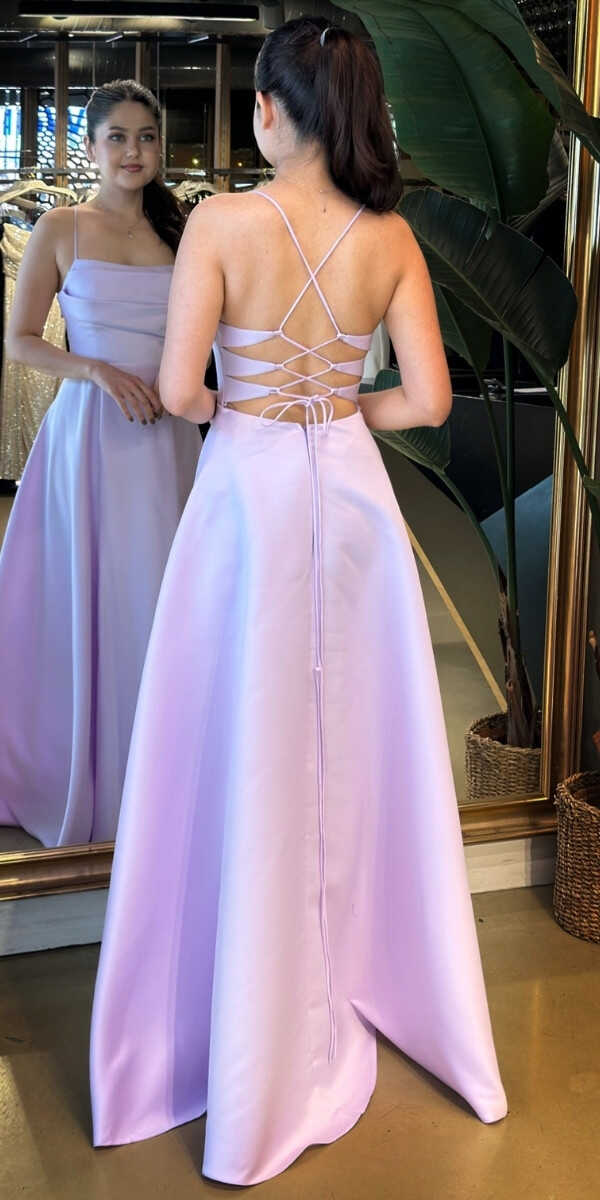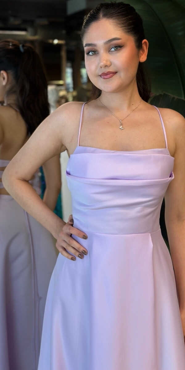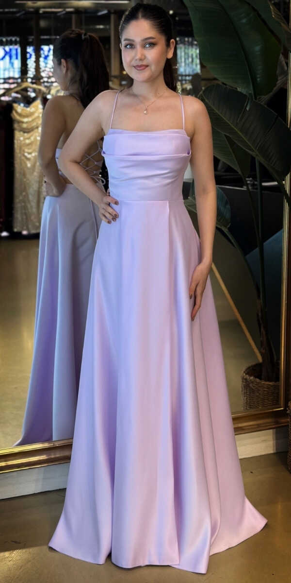 Lila Renk Kloş Etekli Uzun Abiye Elbise, Saten Kumaştan Üretilmiş olup Satenin Pürüzsüz Işığı Görünümünüze Zarafet Katacaktır. Elbisedeki İp Askılar Kullanım Kolaylığı Yaratacaktır. Şık Sırt Dekoltesi Size Çok Yakışacak.