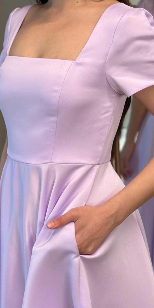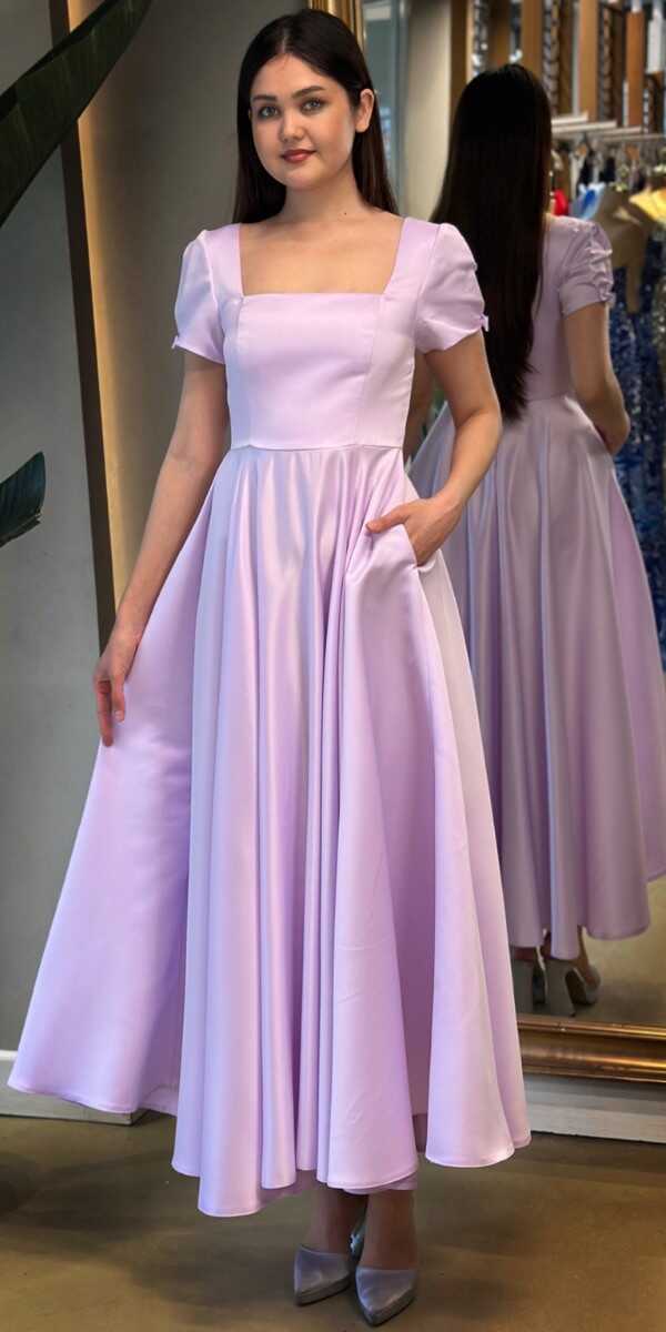 Lila Renk Kloş Etekli Midi Abiye Elbise, Saten Kumaştan Üretilmiş Olup Satenin Pürüzsüz Işığı Görünümünüze Zarafet Katacaktır.