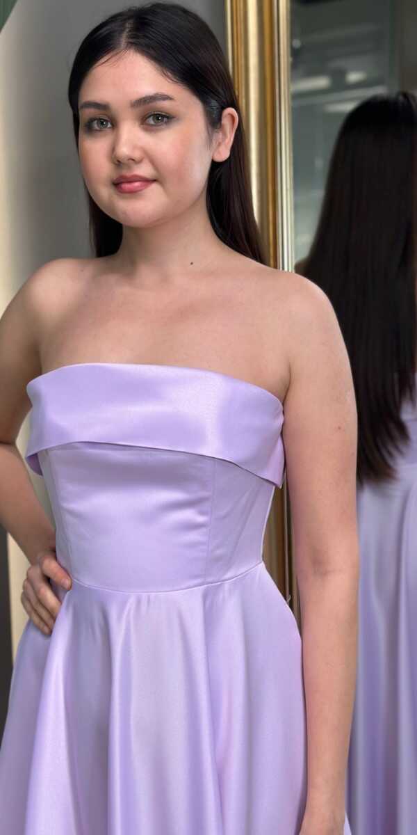 Lila Renk Kloş Etekli Midi Abiye Elbise, Saten Kumaştan Üretilmiş Olup Satenin Pürüzsüz Işığı Görünümünüze Zarafet Katacaktır.