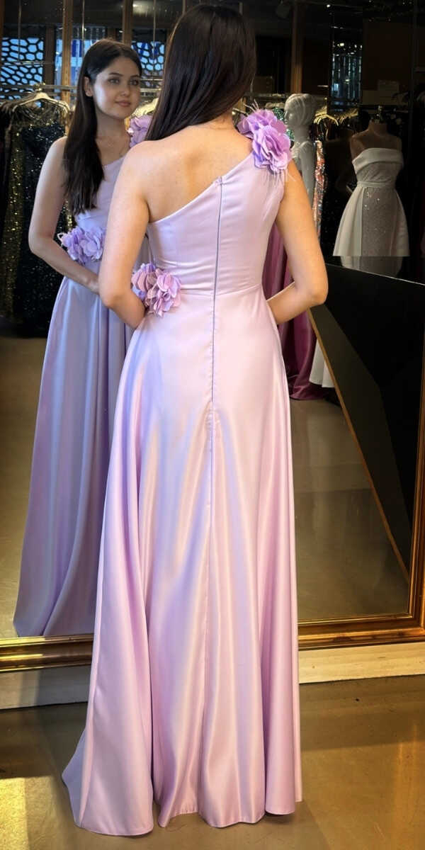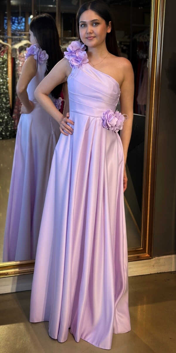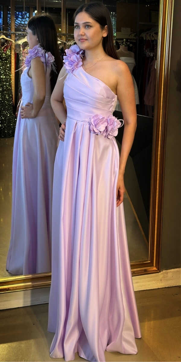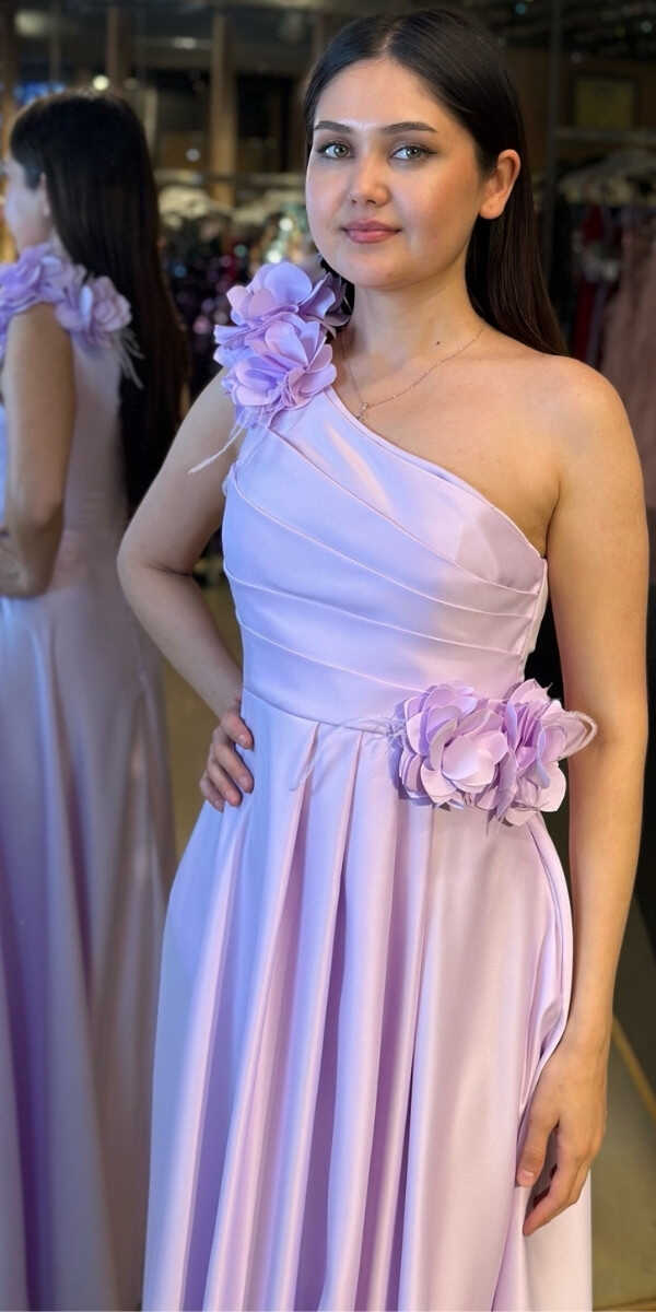 Lila Renk Kloş Etekli Uzun Abiye Elbise, Saten Kumaştan Üretilmiş olup Satenin Pürüzsüz Işığı Görünümünüze Zarafet Katacaktır. Çiçek Detayı Modern Bir Görünüm Yaratacaktır..
