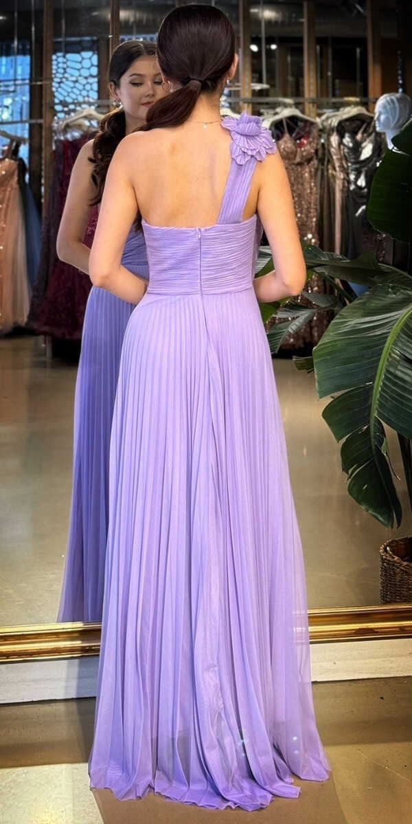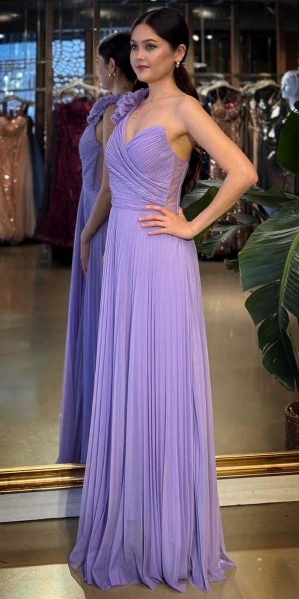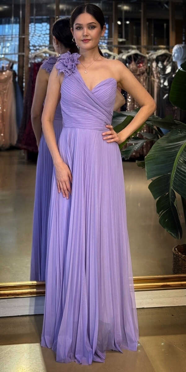 Lila Renk Kloş Etekli Uzun Abiye Elbise, Şifon Tül Kumaştan Üretilmiş olup Şifon tül kumaşıyla uçuş uçuş bir görünüm sağlar. Tek omuz detayıyla modern bir ifade oluşturur.