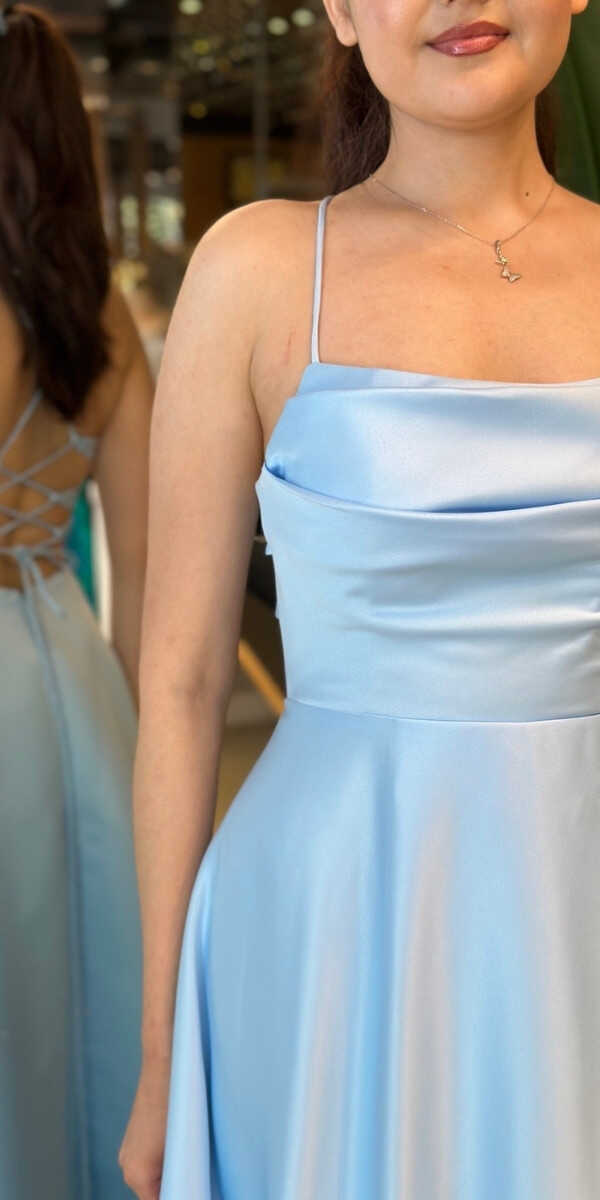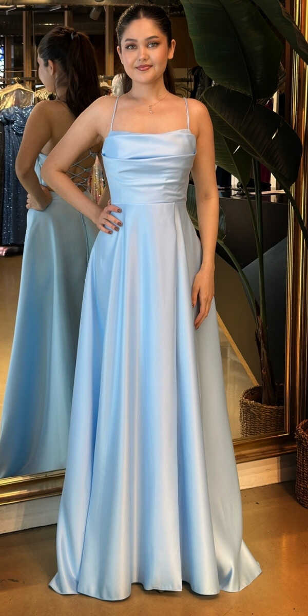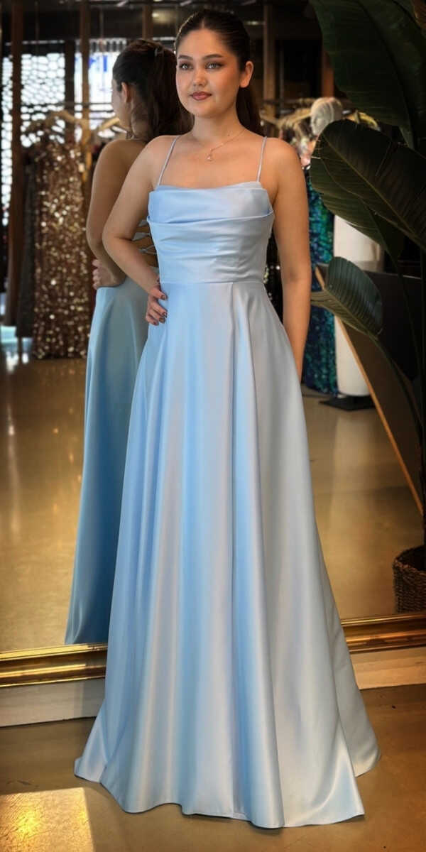Mavi Renk Kloş Etekli Uzun Abiye Elbise, Saten Kumaştan Üretilmiş olup Satenin Pürüzsüz Işığı Görünümünüze Zarafet Katacaktır. Elbisedeki İp Askılar Kullanım Kolaylığı Yaratacaktır. Şık Sırt Dekoltesi Size Çok Yakışacak.