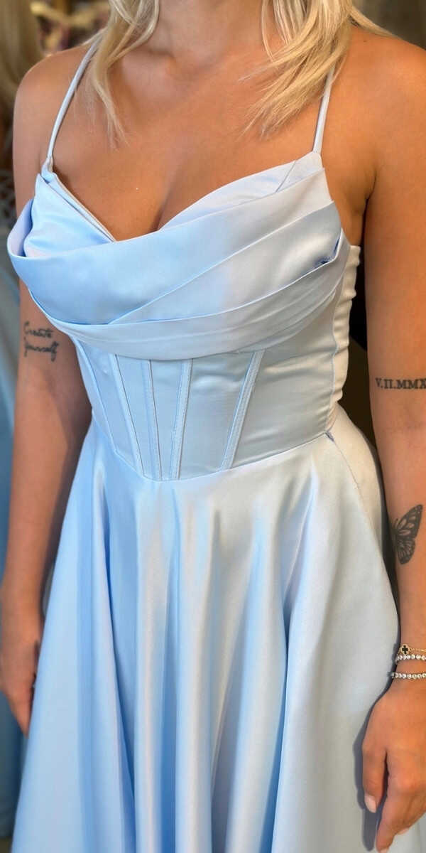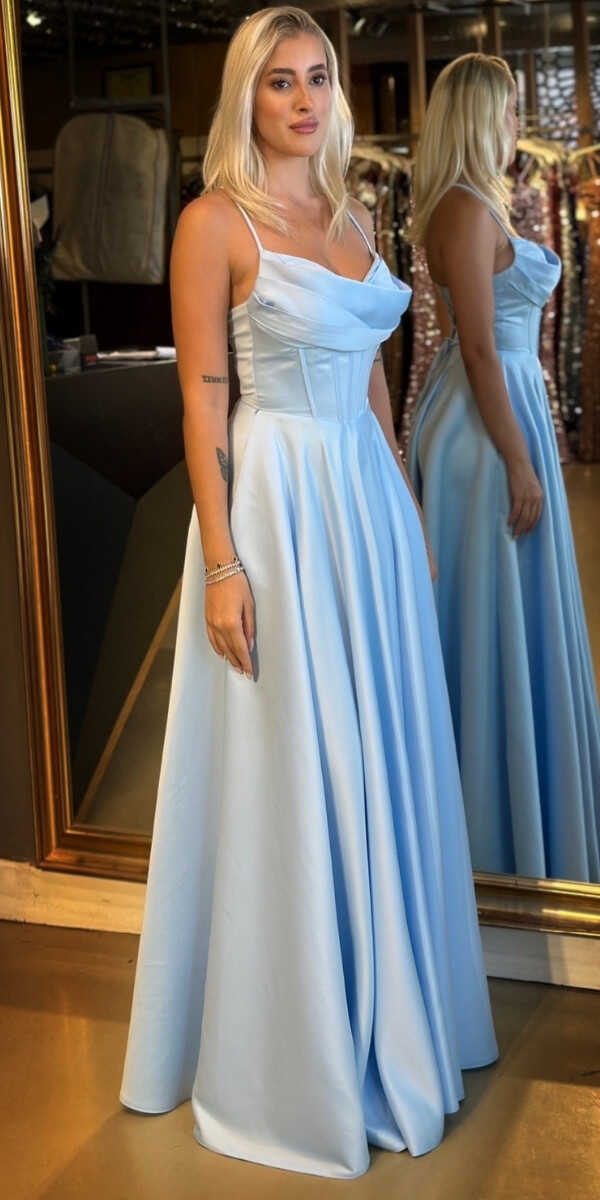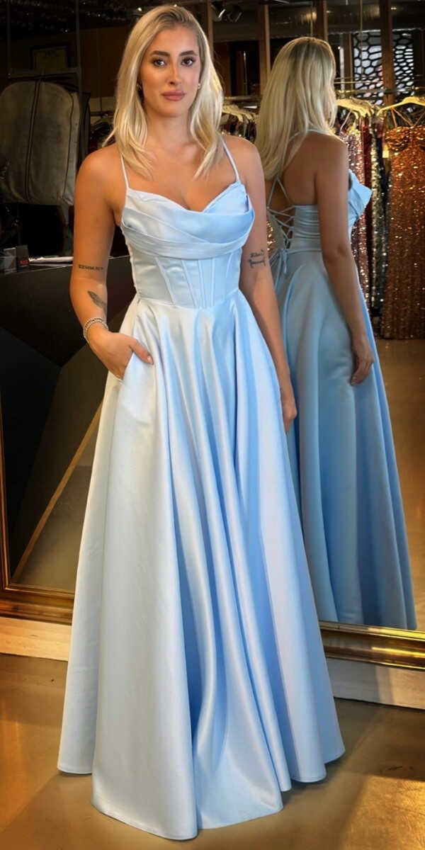 Mavi Renk Kloş Etekli Uzun Abiye Elbise, Saten Kumaştan Üretilmiş olup Satenin Pürüzsüz Işığı Görünümünüze Zarafet Katacaktır. Elbisedeki İp Askılar Kullanım Kolaylığı Yaratacaktır. Şık Sırt Dekoltesi Size Çok Yakışacak.
