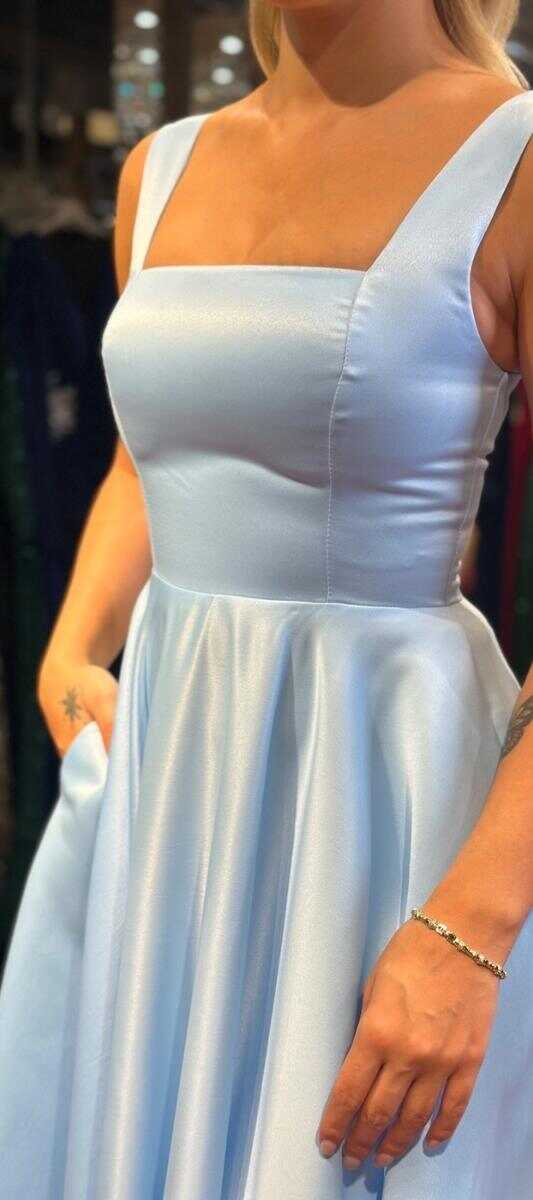 Mavi Kalın Askı Kloş Etekli Saten Midi Abiye Elbise 7631