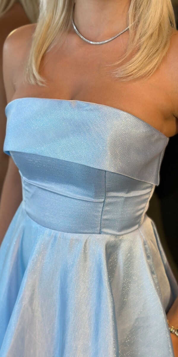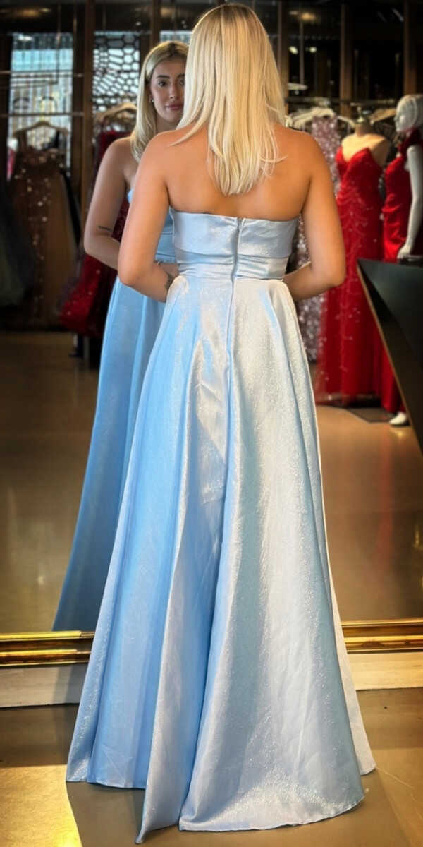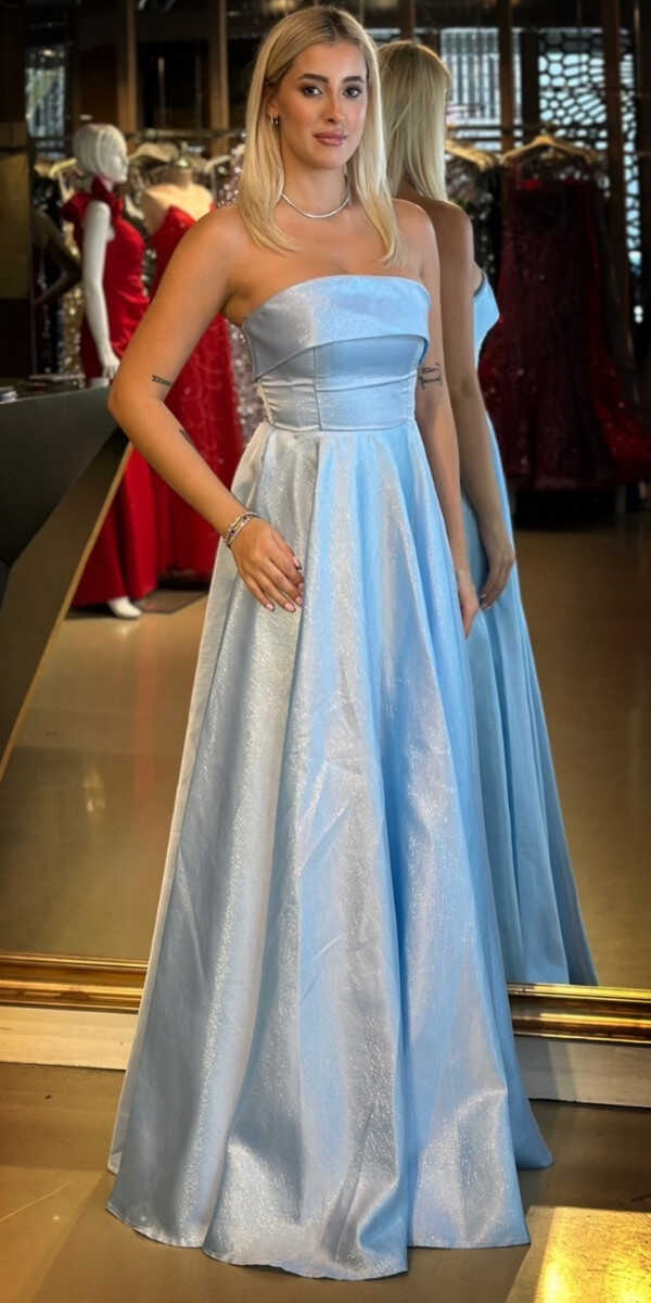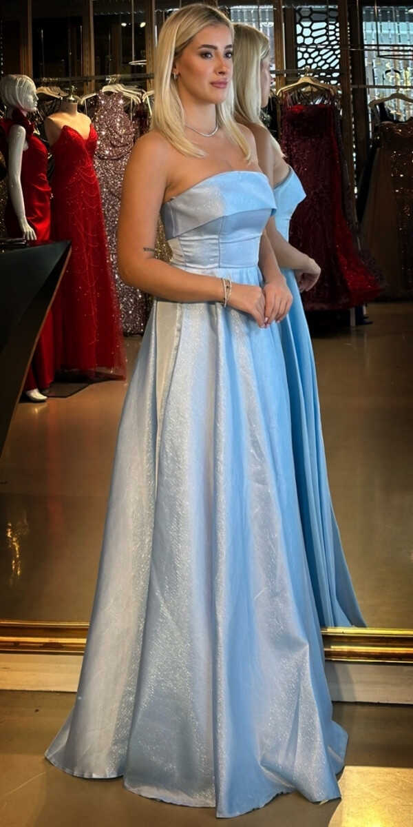 Mavi Renk Kloş Etekli Uzun Abiye Elbise, Saten Kumaştan Üretilmiş olup Satenin Pürüzsüz Işığı Görünümünüze Zarafet Katacaktır.