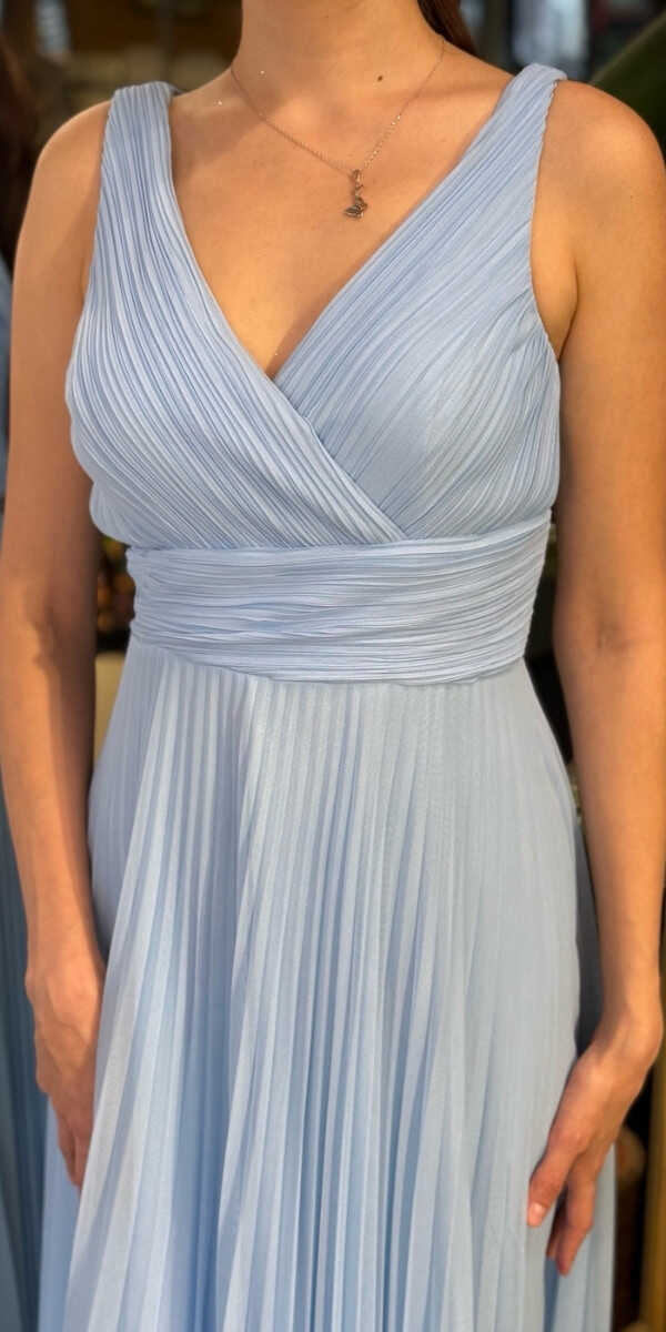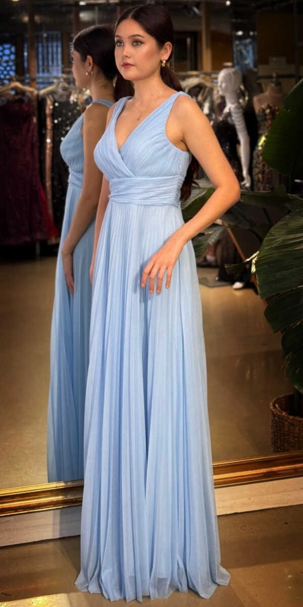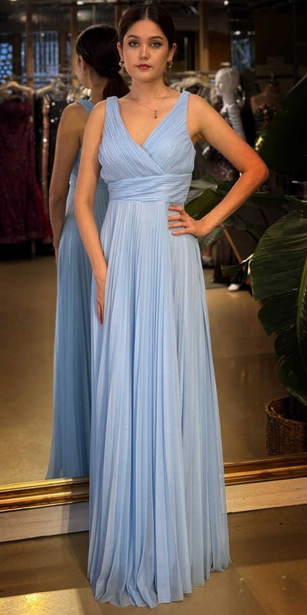 V Yaka Mavi Renk Kloş Etekli Uzun Abiye Elbise, Şifon Kumaştan Üretilmiş olup Uçuş Uçuş Şifon Kumaş Tüm Dikkatleri Üzerinize Toplayacaktır. Kalın askılı yapısıyla destekleyici ve modern bir görünüm sağlar.