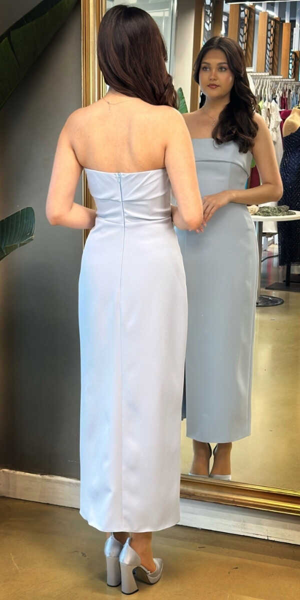 Mavi Renk Düz Kesim Midi Abiye Elbise, Krep Kumaştan Üretilmiş Olup Hafif Ve Daha Az Kırıştığı İçin Kumaş Sizi Rahat Hissettirecektir. Yırtmaç Detayı Cesur ve Çarpıcı Bir Stil Sunacaktır.