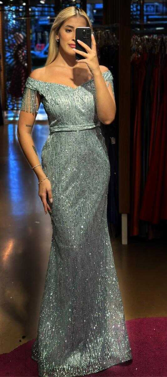 Mint Renk Düz Kesim Uzun Abiye Elbise, Simli Kumaştan Üretilmiş Olup Simlerin Işıltısıyla Çok Hoş Gözükeceksiniz
